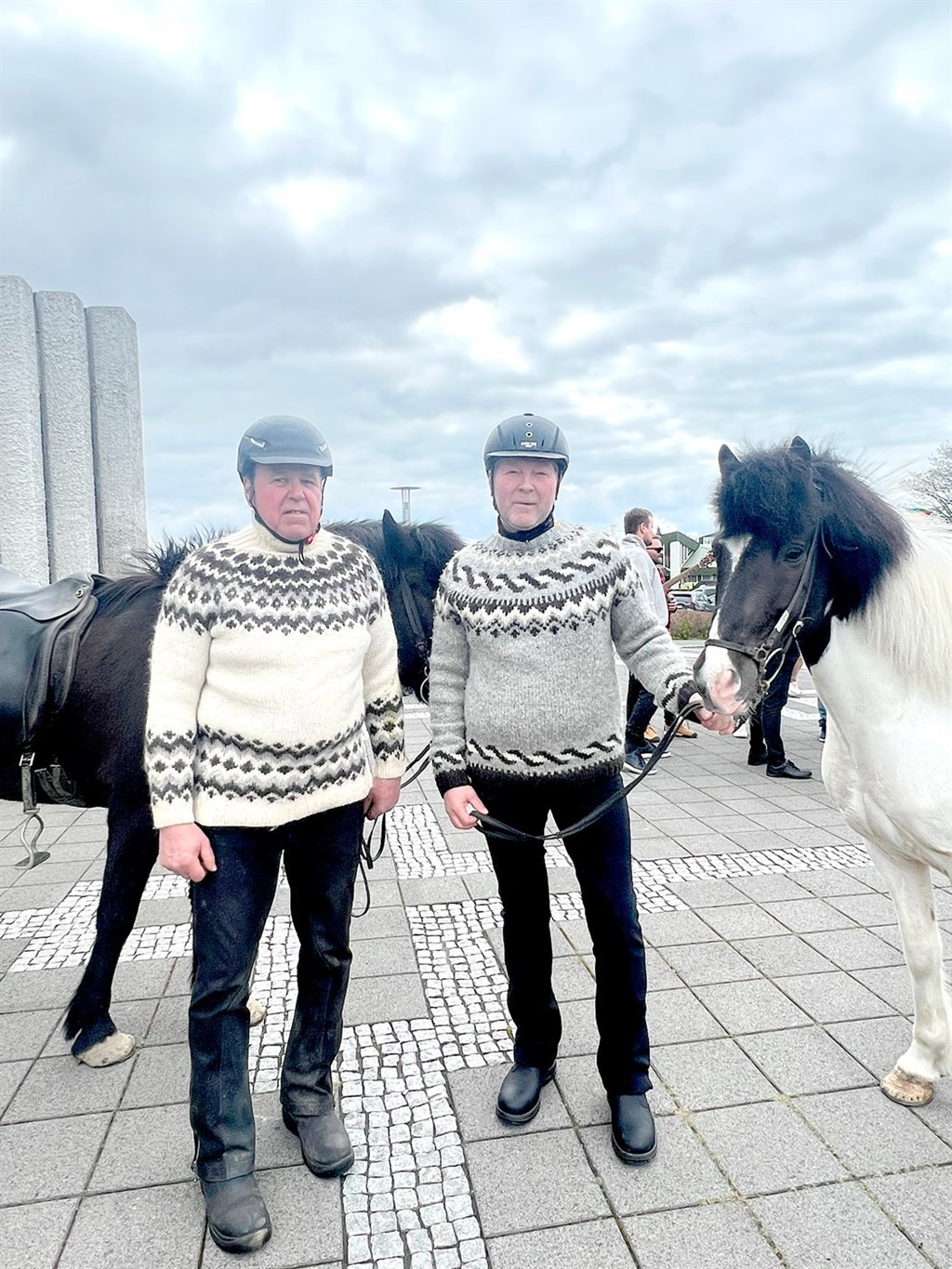 Félagar úr hestamannafélaginu Herði mættu í fallegum íslenskum lopapeysum í miðbæjarreiðina. Á myndinni eru þeir Grettir Börkur Guðmundsson og Jón Kristinn Kristjánsson með fáka sína.