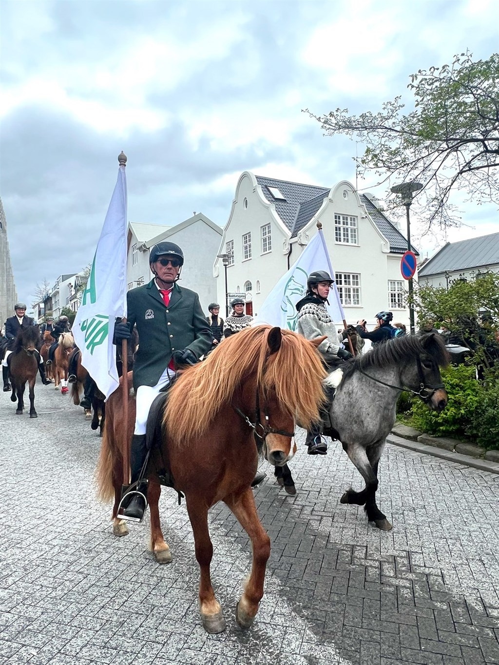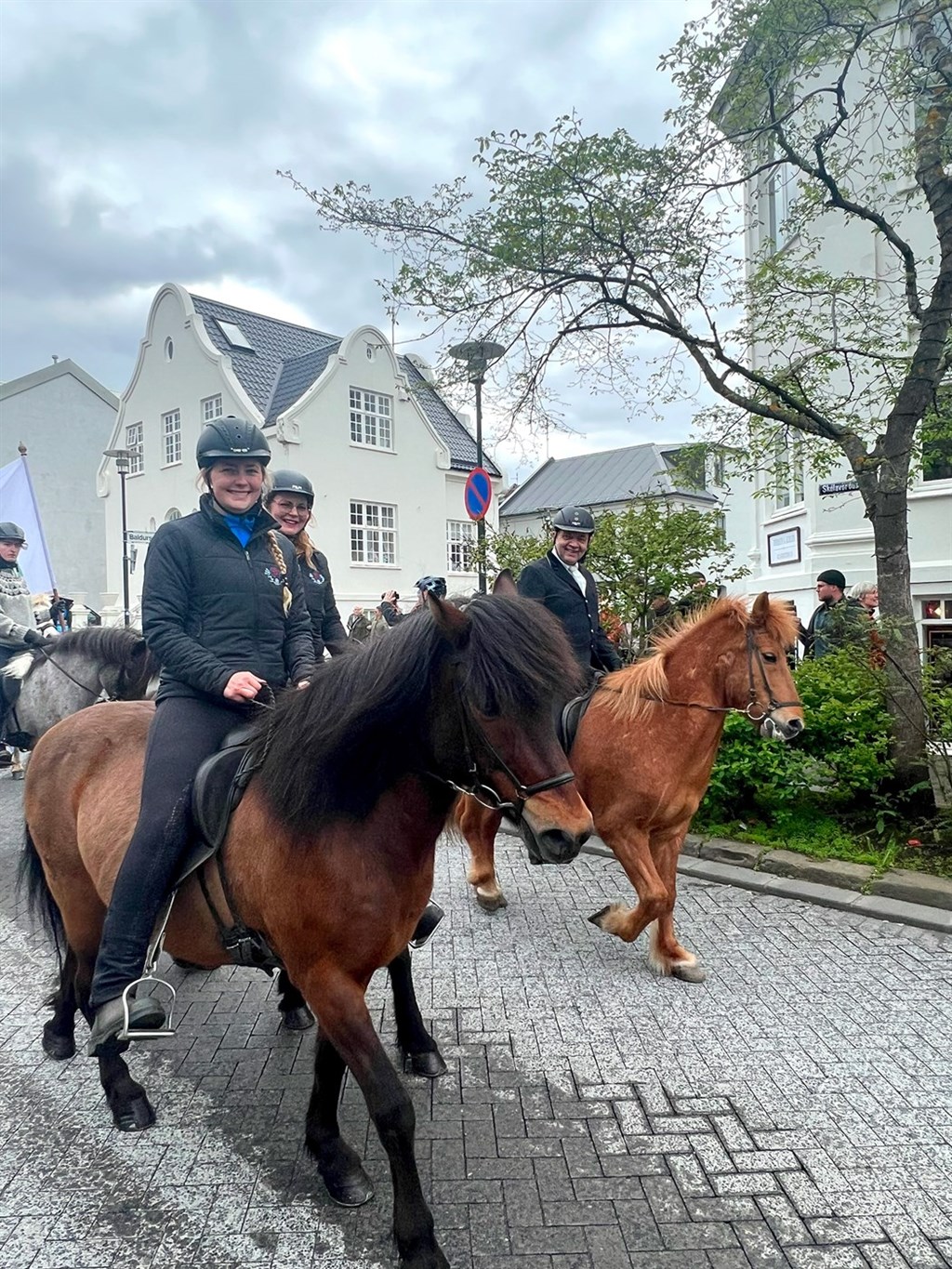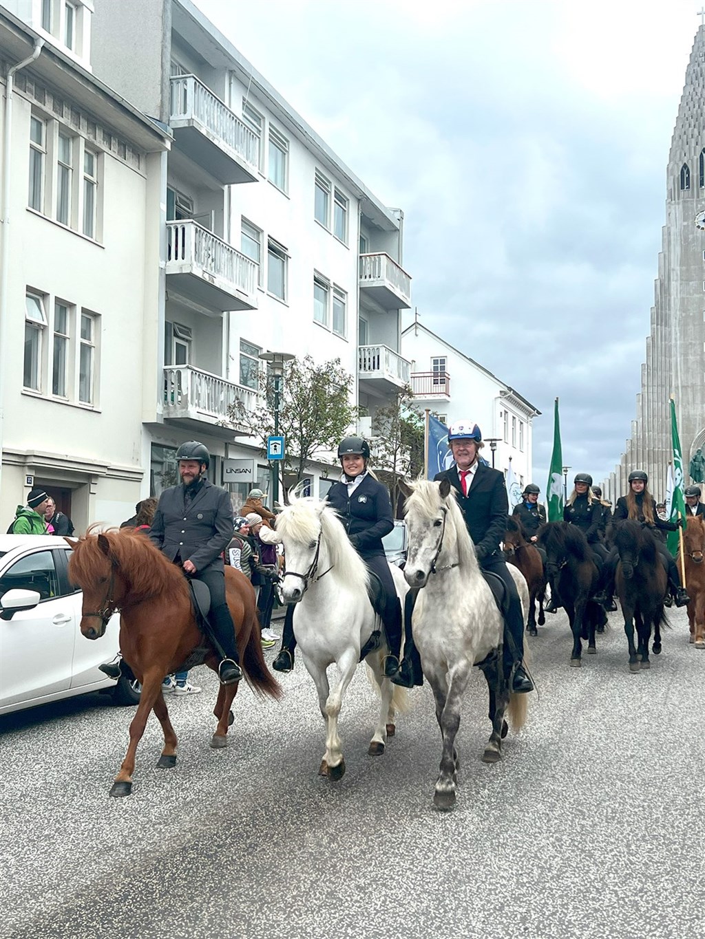 Fremst í flokki riðu Guðni Halldórsson, formaður Landssambands hestamannafélaga, Áslaug Arna Sigurbjörnsdóttir háskóla-, iðnaðar- og nýsköpunarráðherra og Sigurbjörn Bárðarson landsliðseinvaldur í hestaíþróttum.