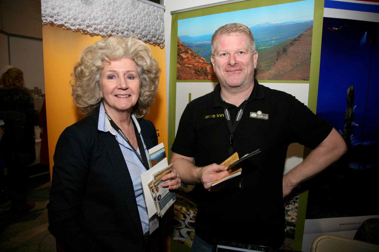 Karl Jónsson á Mannamóti, sem haldið var í Reykjavík á dögunum, en þar kynnti hann bjórferðir sem í boði eru á vegum Lamb inn Travel. Aldís Aðalbjarnardóttir leiðsögumaður er hér á spjalli við Karl. Mynd / TB