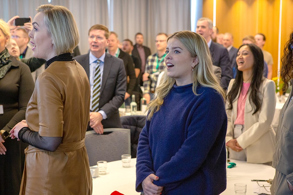 Allur salurinn tók undir með Guðna Th. Jóhannessyni. Fremst standa ráðherrarnir Guðrún Hafsteinsdóttir og Áslaug Arna Sigurbjörnsdóttir.