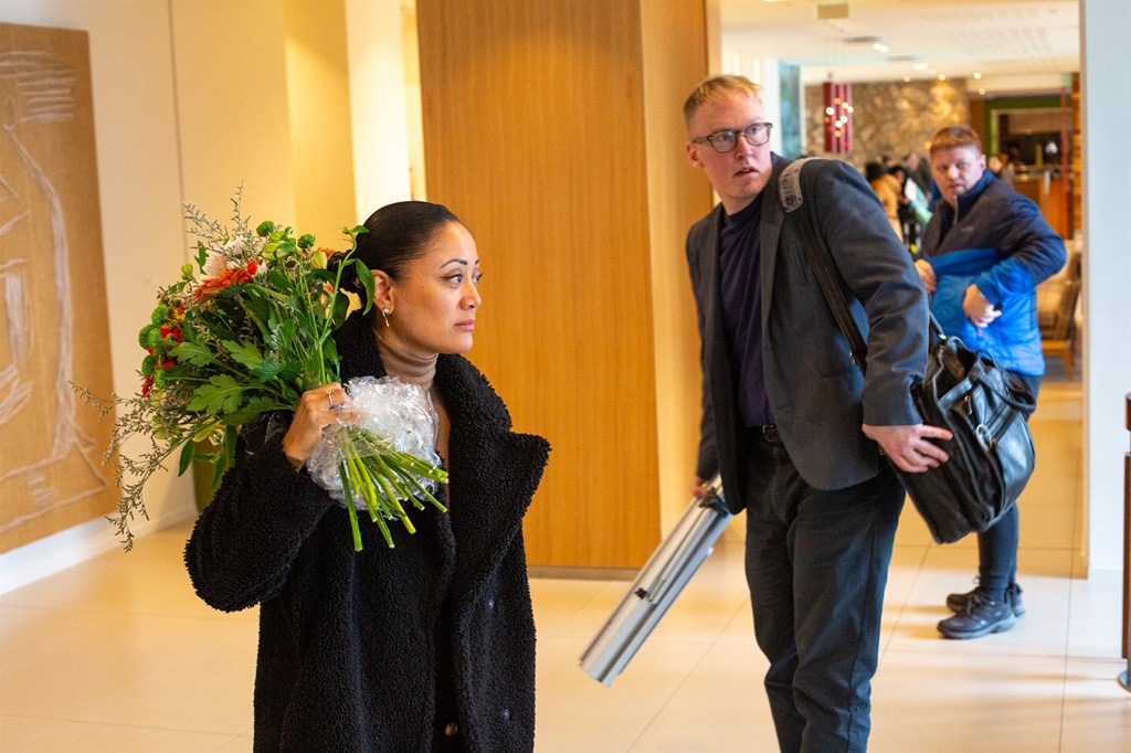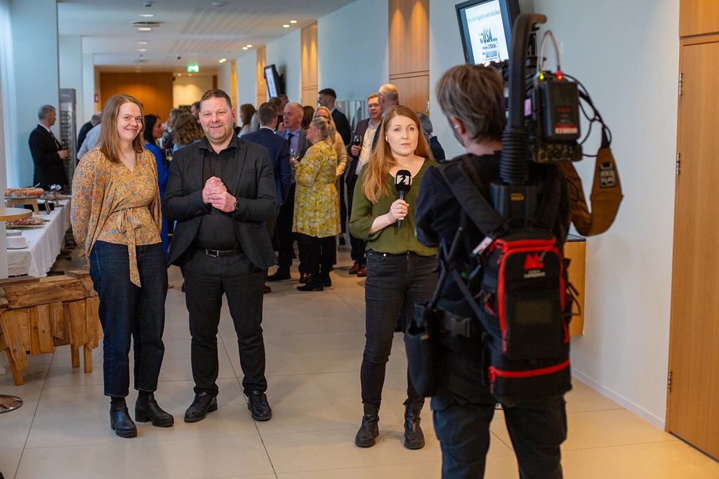 Bændurnir Halla Sif Svansdóttir Hölludóttir og Reynir Þór Jónsson gera sig klár fyrir sjónvarpsviðtal í beinni útsendingu á Stöð 2.