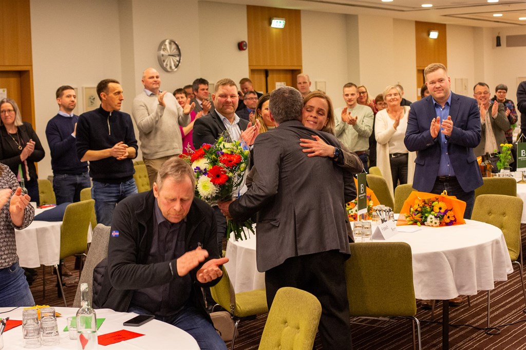 Á Búnaðarþingi lét Gunnar Þorgeirsson af störfum sem formaður Bændasamtaka Íslands. Hér tekur Herdís Magna Gunnarsdóttir utan um hann eftir að hann flutti sína síðustu ræðu í embætti.