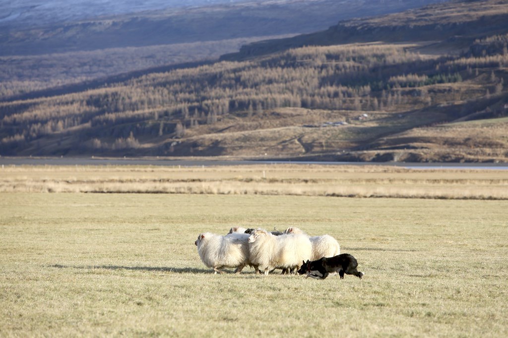 Blessaðar skjáturnar reyndu að þrjóskast við og standa sem fastast en góður fjárhundur lætur það ekki á sig fá og hættir ekki fyrr en fé er komið þangað sem fyrir er sett. Mynd / Gunnar Gunnarsson