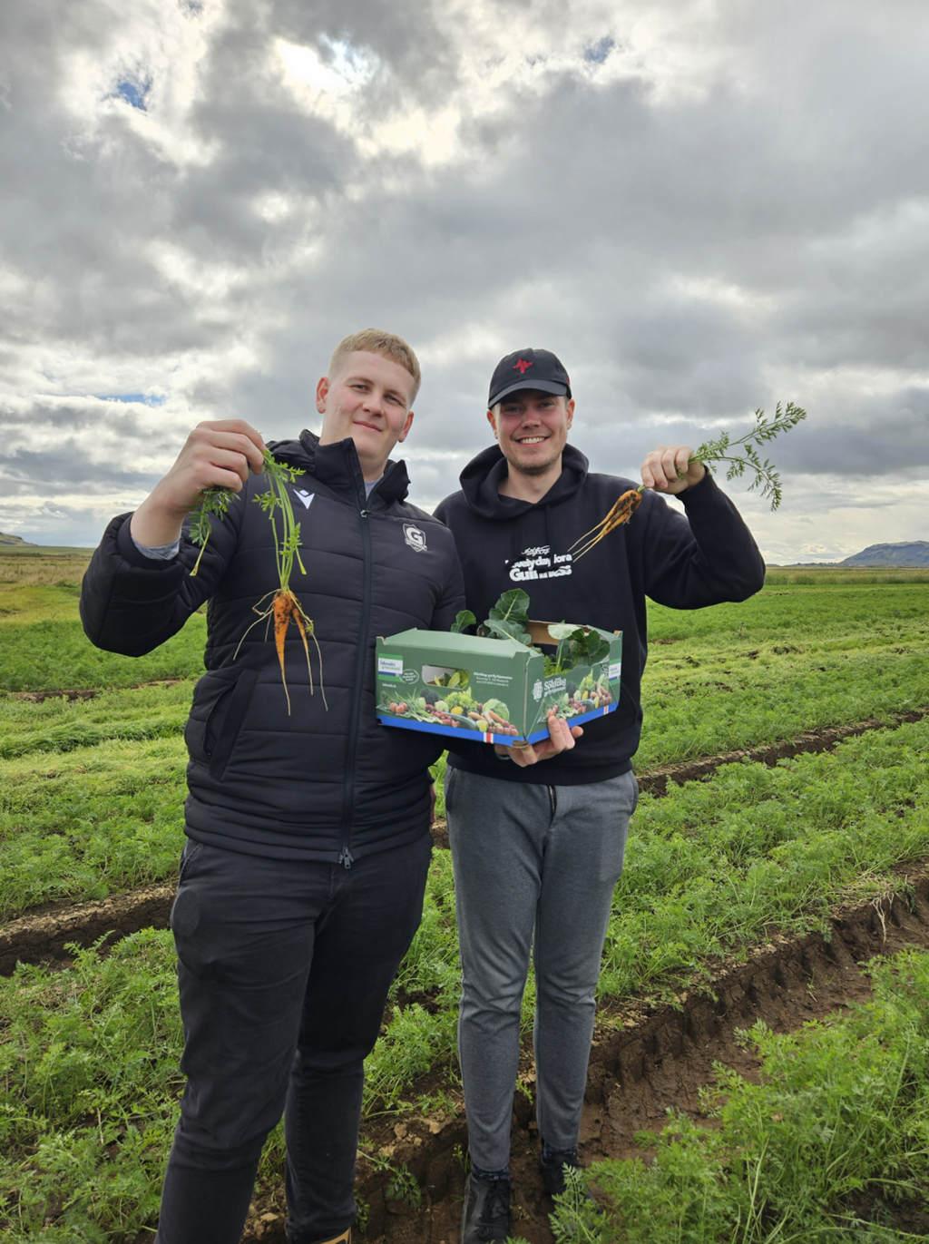 Vilberg Darri Gunnarsson (t.v.) og Tómas Andri Jörgensson voru ánægðir með nýuppteknu gulræturnar.