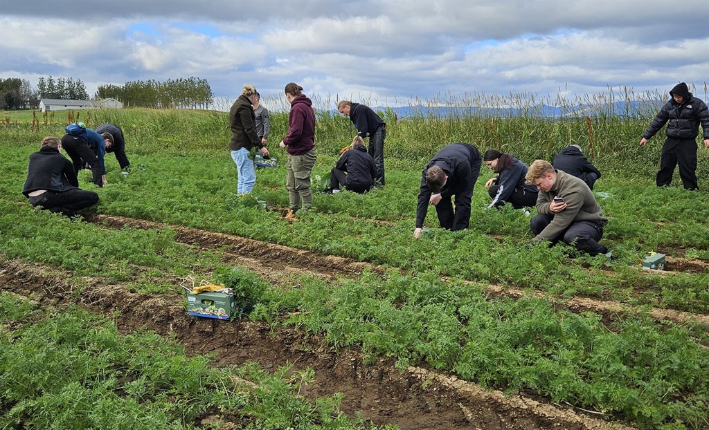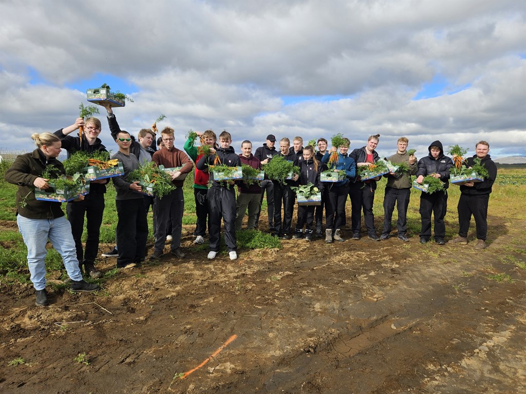 Nemendur Menntaskólans í Kópavogi saman komnir í grænmetisgarði með ferskt og fallegt grænmeti, alsælir með heimsóknir sínar til garðyrkjubænda.