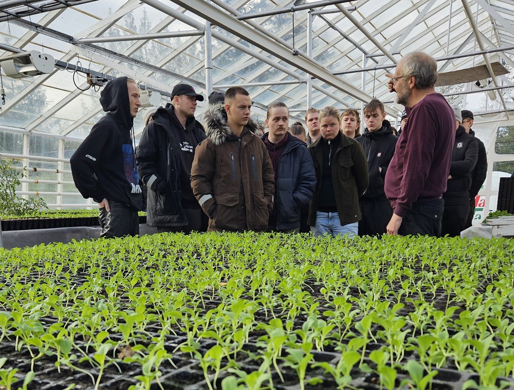 Hlynur Sigurbergsson hjá Garðyrkjustöðinni Kinn í Hveragerði er hér að fræða nemendur um starfsemi stöðvarinnar.