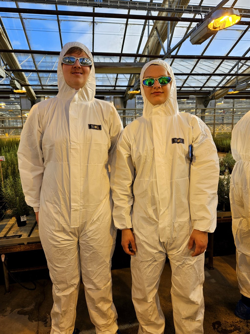 Vígalegir nemendur, eða þeir Jakob Kristinsson (t.v.) og Mikael Máni Oddsson, en allir nemendur voru gallaðir upp í síðustu heimsókninni, sem var í Ártanga, til að koma í veg fyrir að eitthvað krossbærist á milli stöðvanna. Nemendur fengu líka skóhlífar.