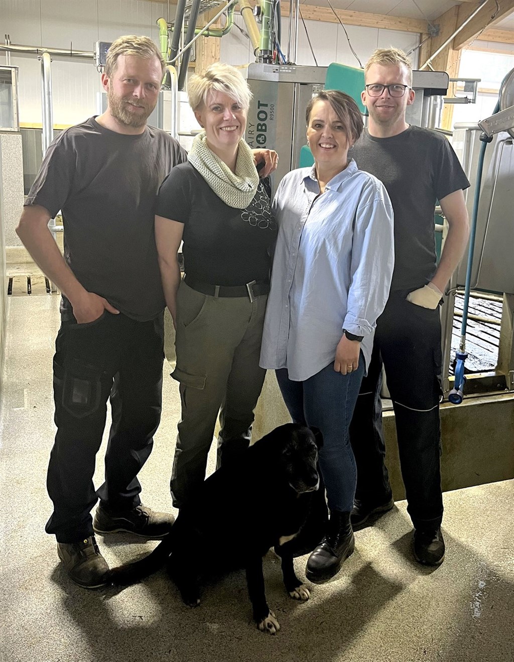 Bræðurnir í Þrándarholti, þeir Ingvar (t.v.) og Arnór Hans, Þrándarsynir, ásamt konum sínum, Magneu Gunnarsdóttur og Sigríði Björk Marinósdóttur, sem eiga heiðurinn af byggingu nýja fjóssins. Með þeim er hundurinn Dimma.