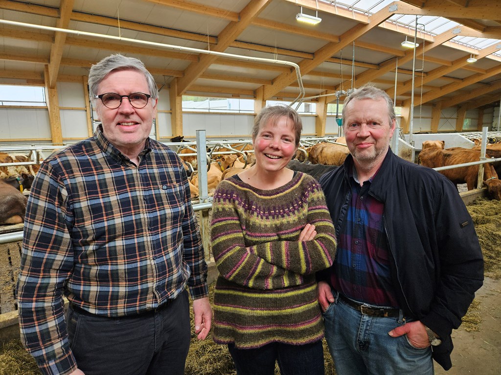 Grétar Hrafn Harðarson dýralæknir, ásamt hjónunum og kúabændunum í Hvammi í Ölfusi, Carlotte Clausen og Pétur B. Guðmundsson.