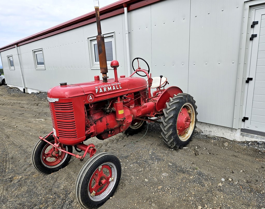 Þessi flotta og forláta dráttarvél stendur við dyrnar inn í nýja fjósið.