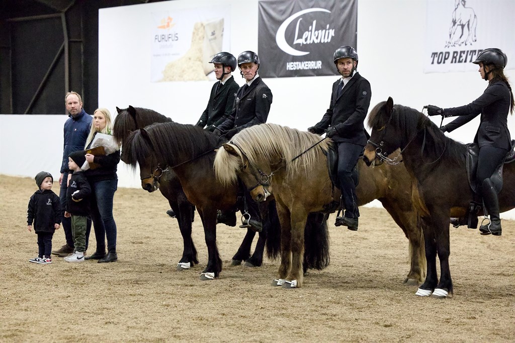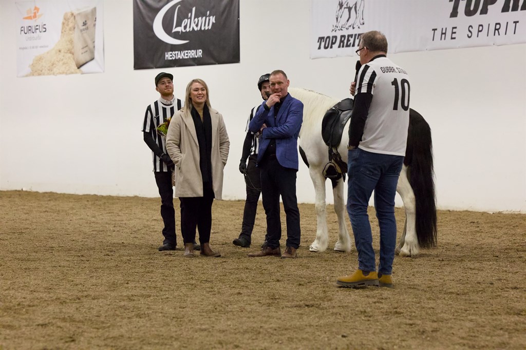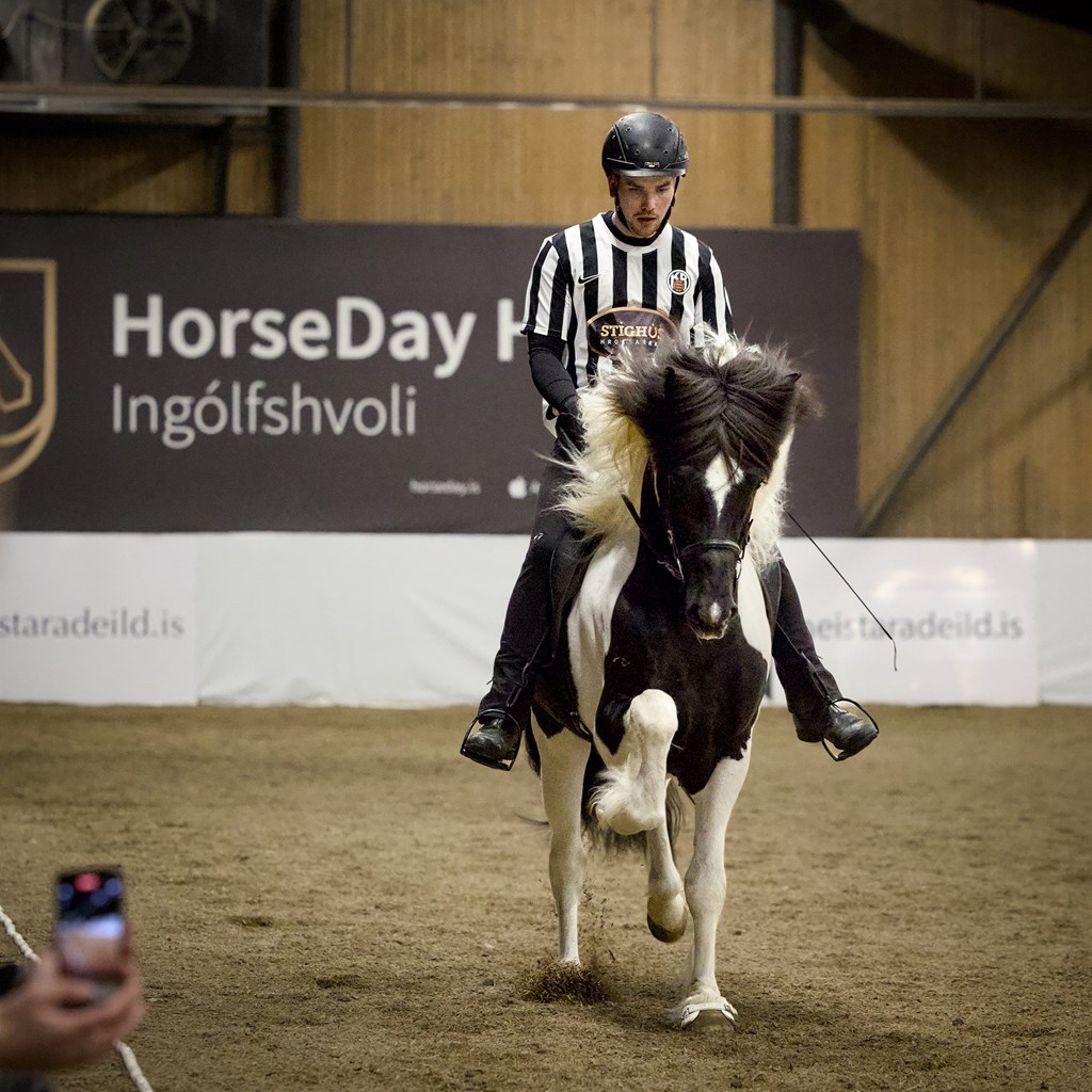 Steinn frá Stíghúsi og Þorgeir Ólafsson skörtuðu svörtu og hvítu til heiðurs KR-ingum og hljómaði stuðningslag félagsins í hljóðkerfinu. Ræktandi Steins, Stígur, er mikill KR-ingur og hafði lengi dreymt um að koma fram með hest frá sér í KR-litunum