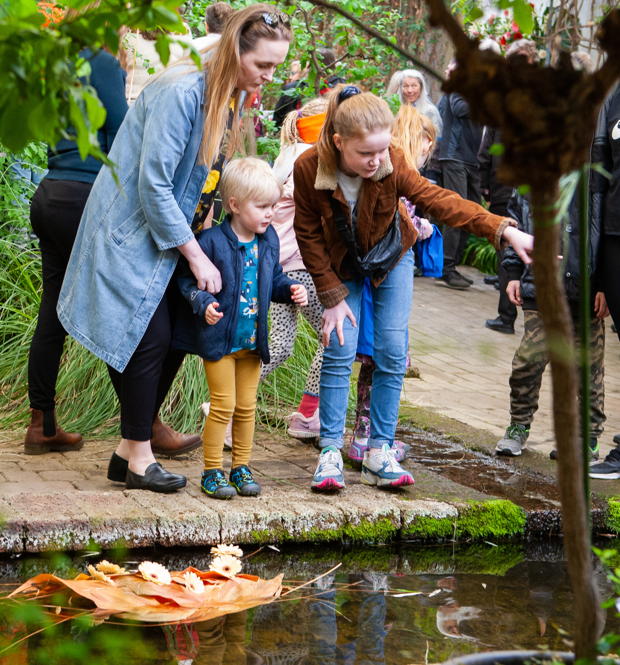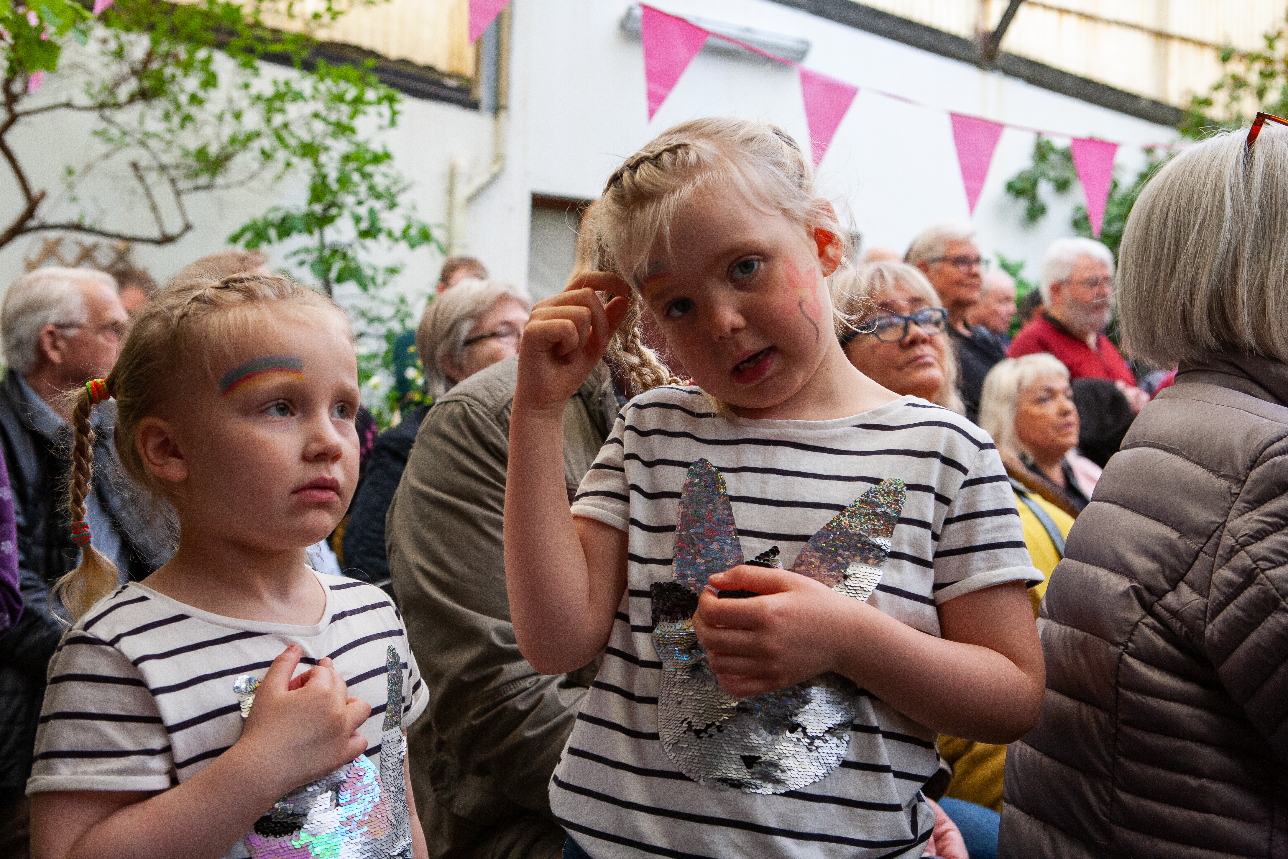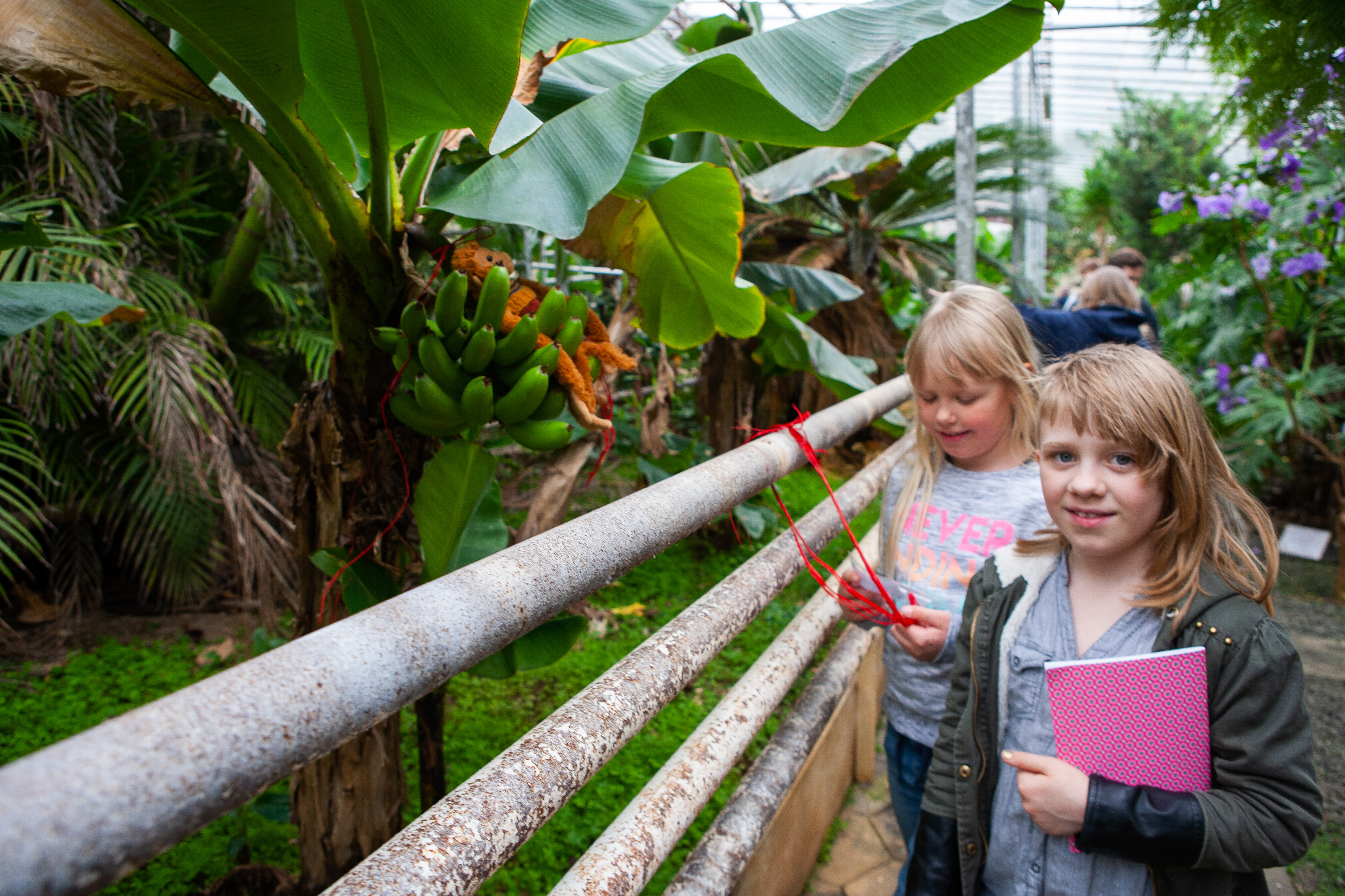 Börnum gafst kostur á að taka þátt í ratleik sem leiddi þau um undraveröld Garðyrkjuskólans. Hér höfðu þessar vinkonur ratað á Bóbó apa á bananaknippi í hitabeltisgróðurhúsinu. Myndir / ghp