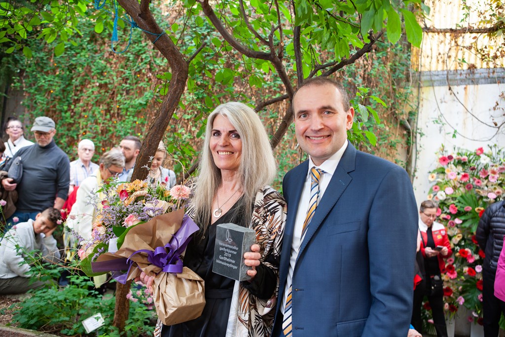 Jóhann Thorarensen, garðyrkjufræðingur hjá Matjurtagörðum Akureyrarbæjar og Guðni Th. Jóhannesson, sem afhenti verðlaunin.