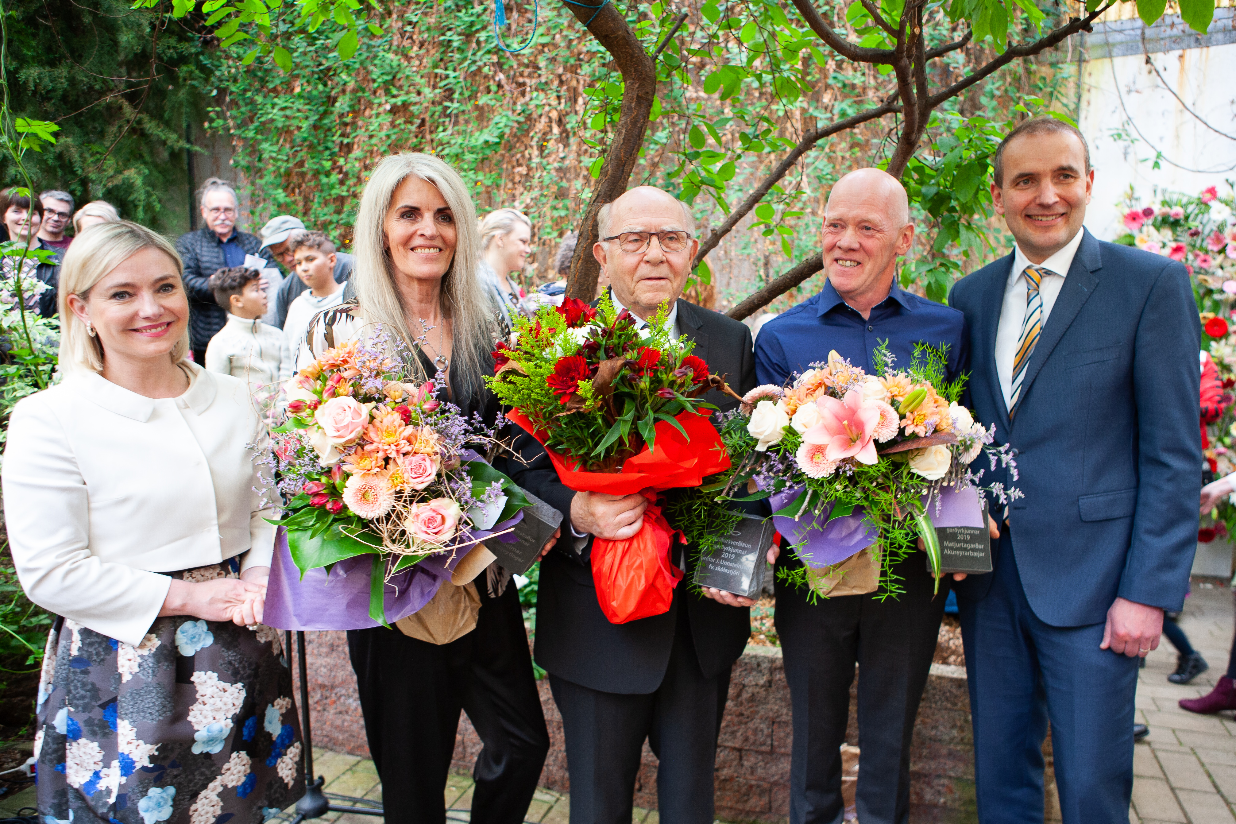 Handhafar Garðyrkjuverðlauna Landbúnaðarháskóla Íslands árið 2019 stilltu sér upp ásamt menntamálaráðherra og forseta Íslands. Frá vinstri: Lilja Dögg Alfreðsdóttir, Jóhanna Margrét Hilmarsdóttir, verknámskennari í blómaskreytingum hjá Garðheimum, Grétar J. Unnsteinsson, fyrrv. skólastjóri Garðyrkjuskóla ríkisins, Jóhann Thorarensen, garðyrkjufræðingur hjá Matjurtagörðum Akureyrarbæjar og Guðni Th. Jóhannesson, sem afhenti verðlaunin.