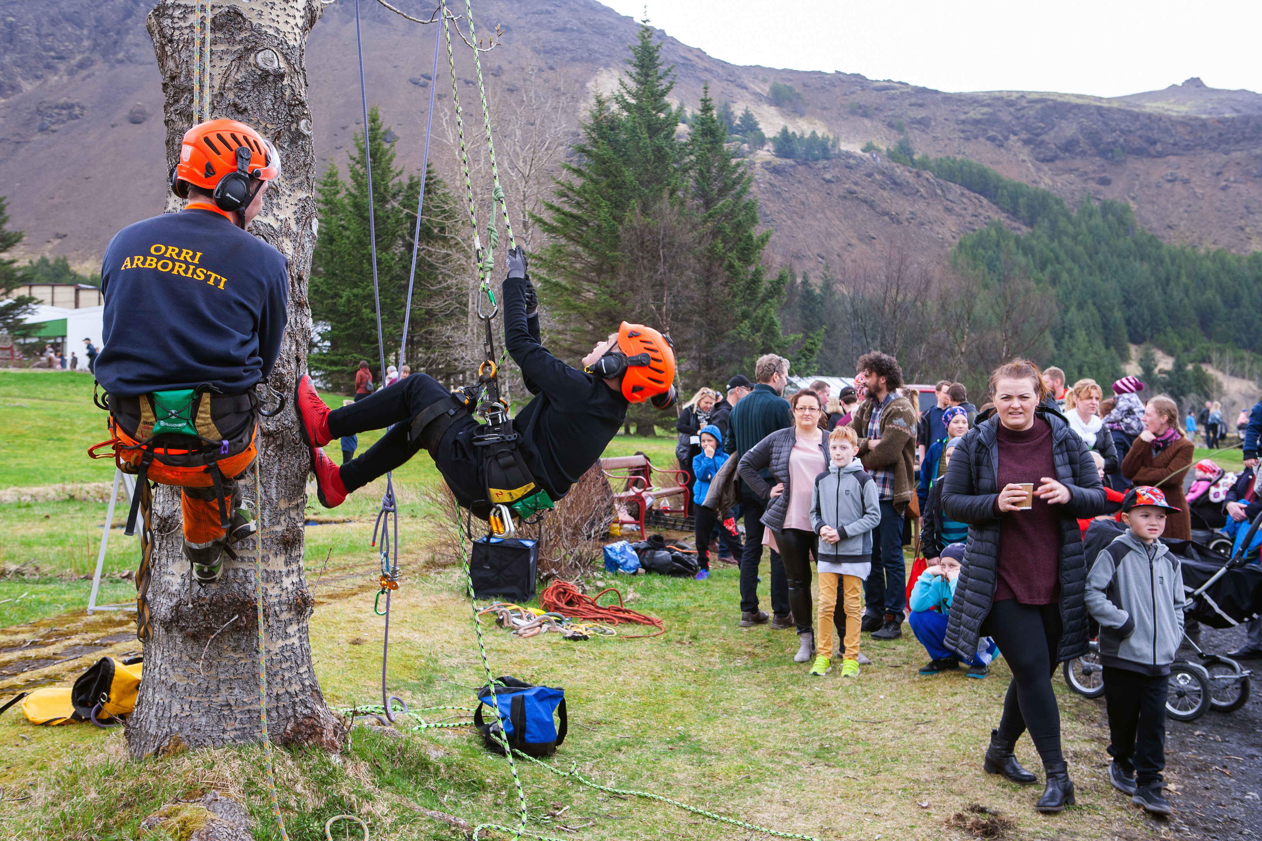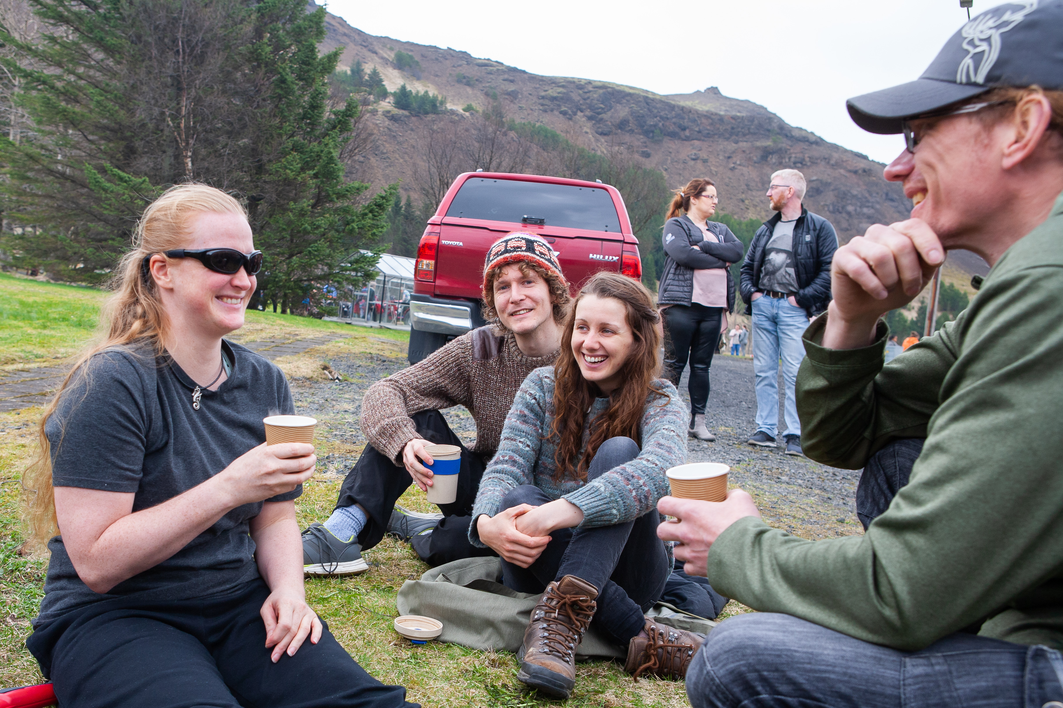 Veðrið lék við gesti á Reykjum. Þessi dreyptu á ketilkaffi skógarhöggsmanna með bestu lyst.