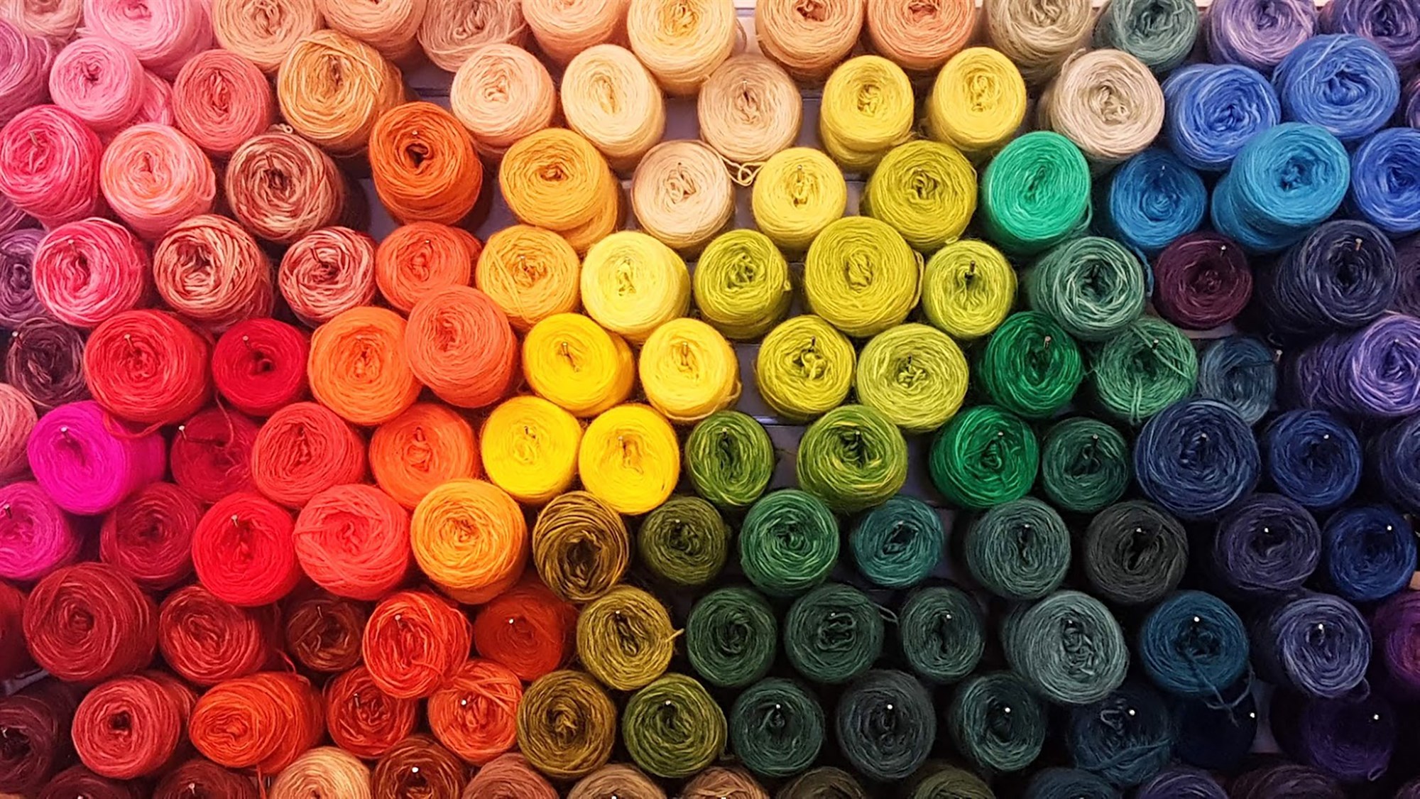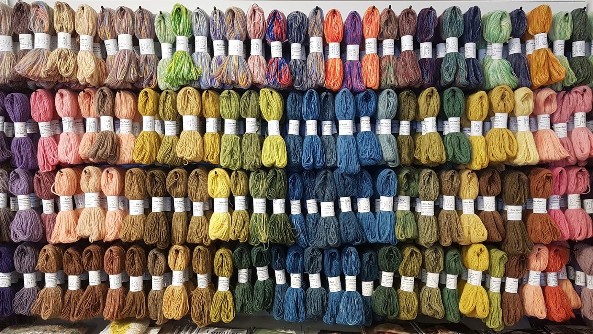 Litaður lopi frá Katrínu Andrésdóttur á vegg í Þingborg.