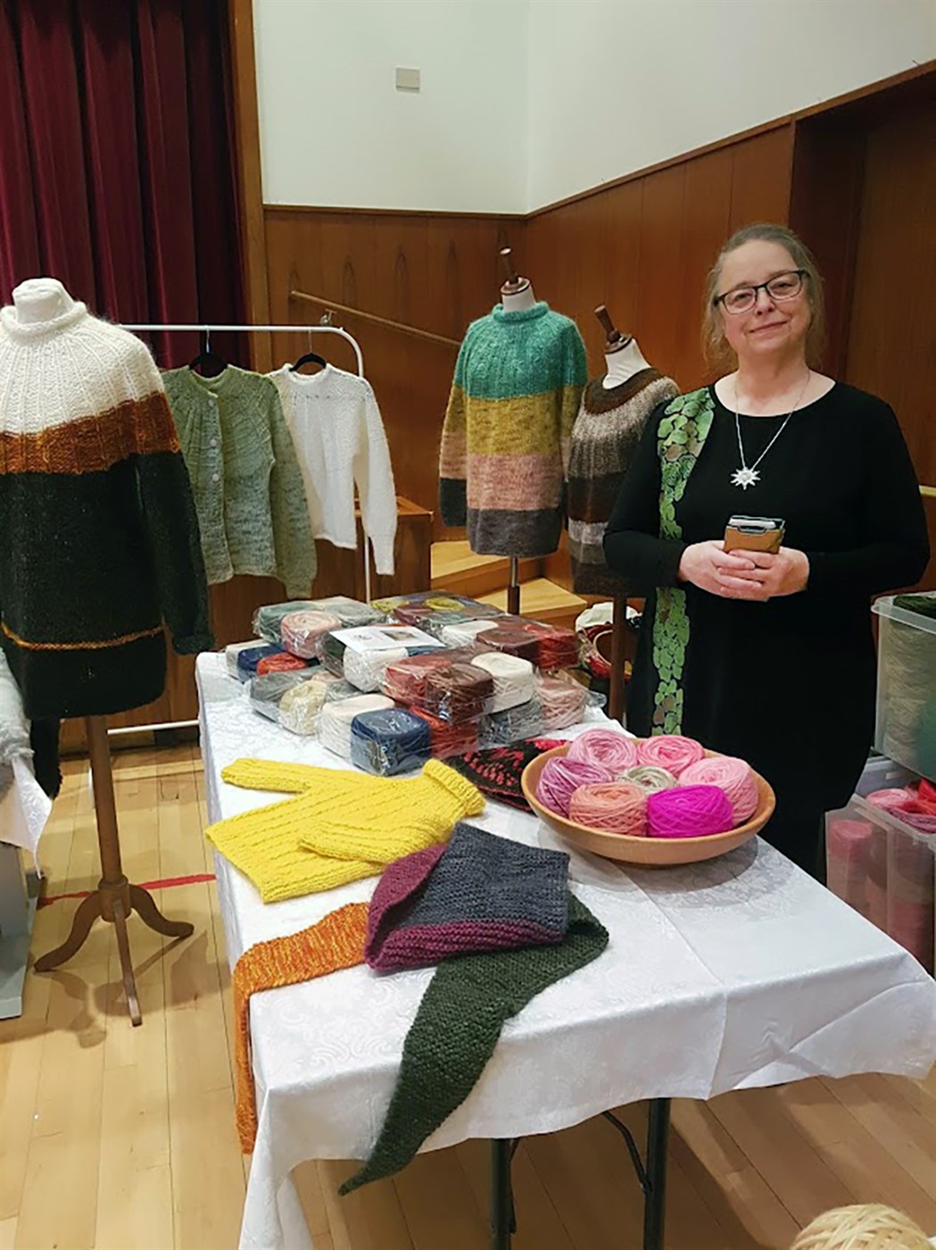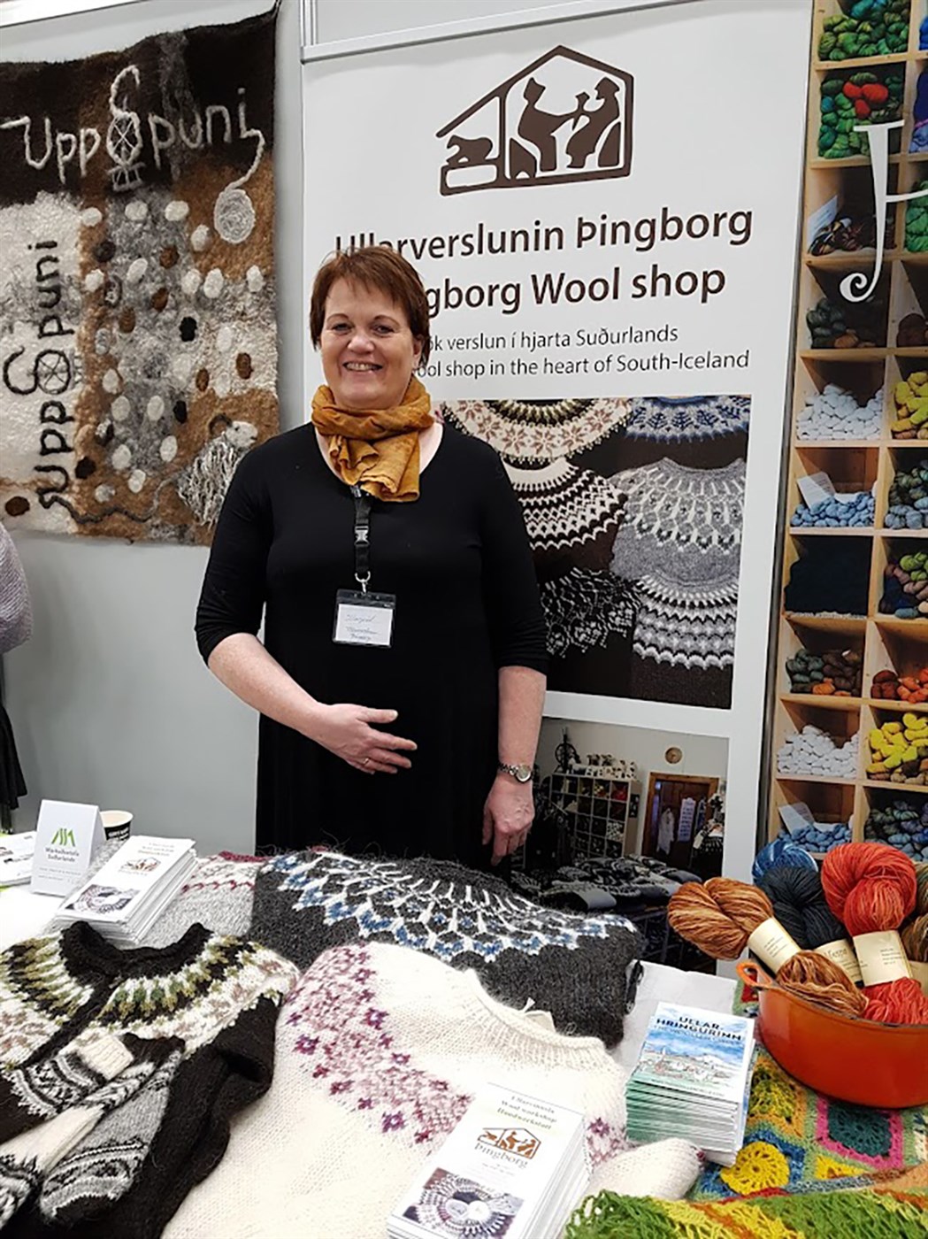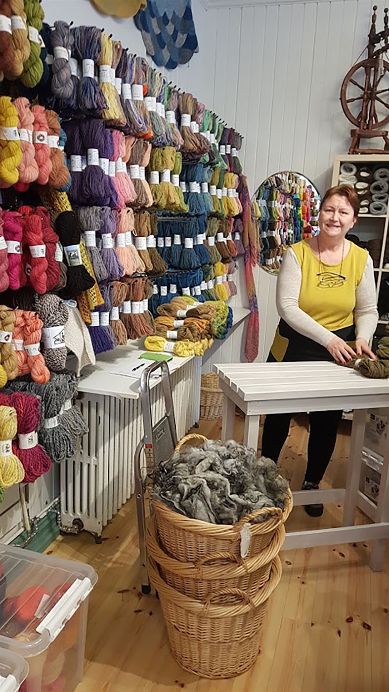 Katrín að kynna litaðan lopann sinn á Uppsprettunni í Árnesi í Skeiða- og Gnúpverjahreppi.