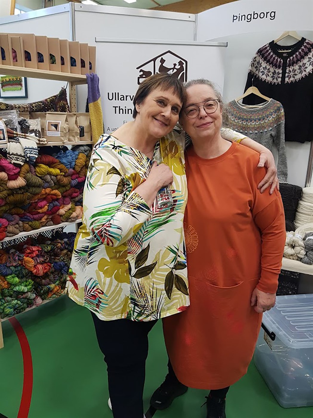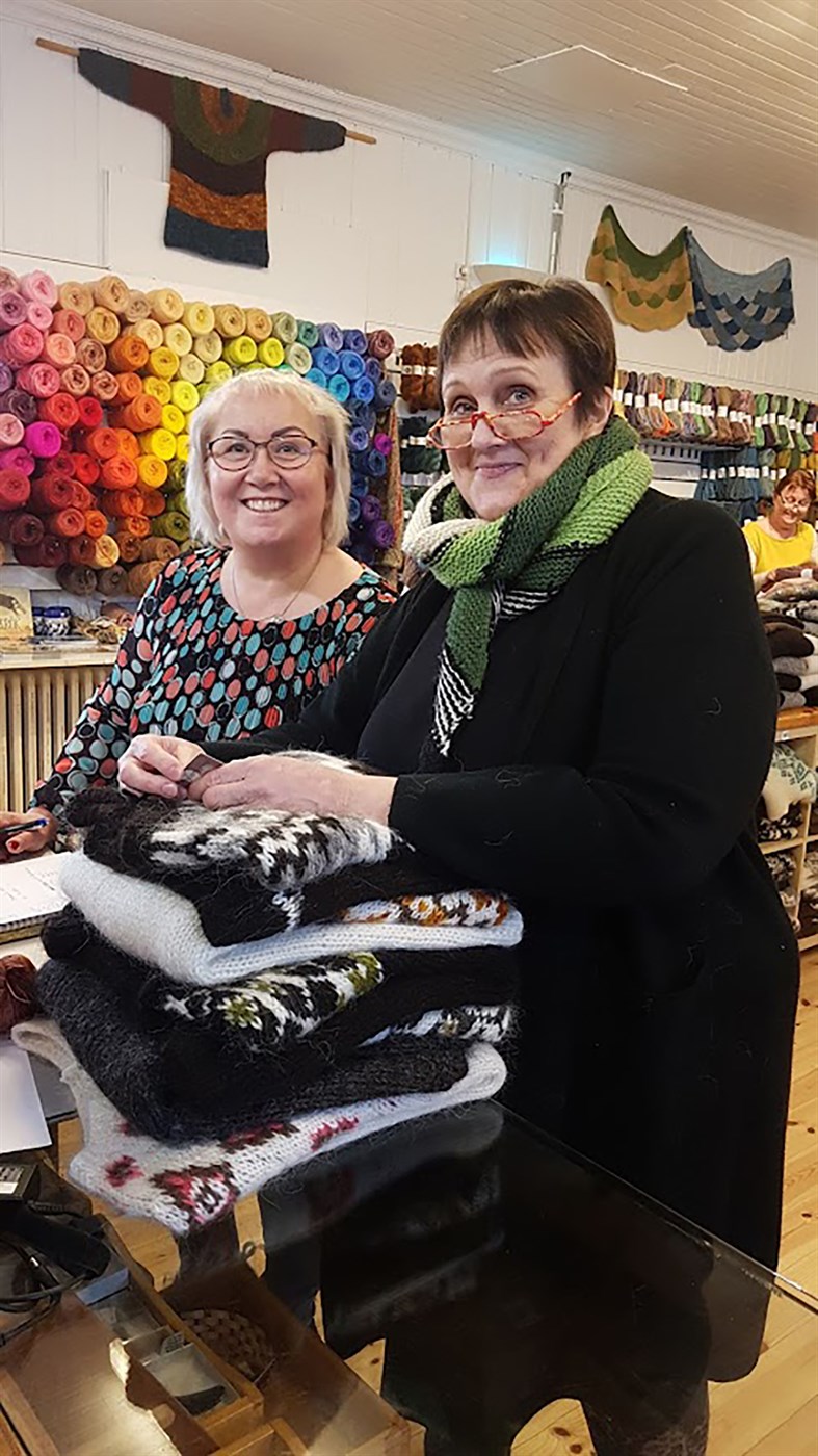 Tvær hressar, Guðný Söring Sigurðardóttir (t.v.) og Hjördís Þorfinnsdóttir, í peysustússi í Þingborg.