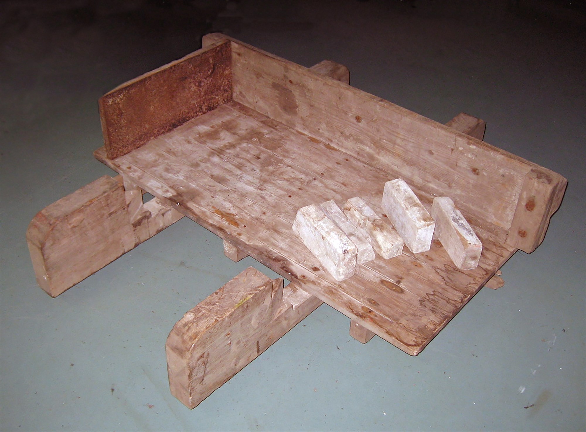 Eins og meðfylgjandi mynd gefur til kynna eru mótin traustlega gerður trépallur, sem á eru borð er mynda rétt horn. Á móti því hefur verið hægt að mynda annað horn með borðum, sem stillt skyldu af með okum/kubbum. Virðist þannig hafa mátt ráða stærð steinanna.