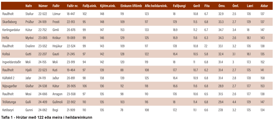 Kútur 22-752 frá Kerlingardal í Mýrdal skorar hæst heildareinkunn. Hann er sonur Gimla 20-876 frá Hesti. Að baki móður hans í fjórða lið standa stöðvahrútarnir Bekri 12-911, Borði 08-838 og Raftur 05-966 allir frá Hesti og síðan er Ljómi 98-865 frá Brautartungu MMMF. Flekkur 24-013 á Kópsvatni 2, sonur Fannars 23-925 frá Svínafelli 2, sýnir mjög afgerandi yfirburði bæði í mati á lifandi lömbum og í kjötmatshlutanum. Flekkur er arfhreinn fyrir mögulega verndandi breytileikanum H154. Móðir hans er sonardóttir Óðins 15-992 frá Skörðum. Myrkvi 23-065 frá Hriflu skilar afgerandi best gerða sláturlambahópnum í Hriflu og mat á lifandi lömbum styður vel við það. Myrkvi er dóttursonur Gláms 16-825 frá Svartárkoti en faðir Myrkva er sonarsonur Hroka 15-969 frá Hesti og dóttursonur Dranga 15-989 frá Hriflu. Jafar 24-119 á Kálfafelli 2 í Suðursveit er einn af athygliverðum sonum Jaðurs 20-891 frá Múlakoti sem fram komu í afkvæmarannsóknum þetta árið. Jafar sýnir mikla yfirburði bæði í mati á lifandi lömbum og í kjötmatshlutanum. Móðir Jafars er sonardóttir Garra 11-908 frá StóraVatnshorni. (Tafla 1 – Hrútar með 122 eða meira í heildareinkunn)