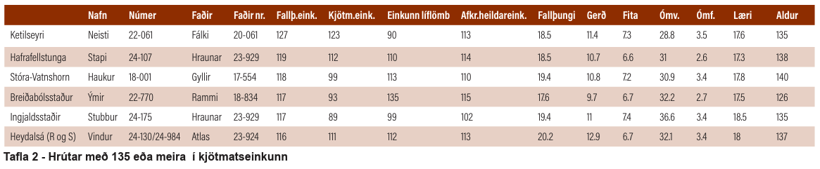 Þegar raðað er eftir kjötmatseinkunn skipa toppinn þeir Stallur 22-522 frá Rauðholti í Hjaltastaðaþinghá og Prúður 24-109 frá Skarðaborg í Reykjahverfi. Styrkleiki afkvæma Stalls 22-522 er góð gerð en fremur litil fita og kemur það vel fram bæði í mati á lifandi lömbum og í sláturhúsi. Stallur stóð einnig efstur í afkvæmarannsókn í Rauðholti haustið 2024 og var í öðru sæti árið þar á undan. Stallur rekur ættir í þriðja lið til þekktar kynbótahrúta, þeirra Grábotna 06-833 frá Vogum, Hvata 13-926 frá Hesti og Kletts 13962 frá Borgarfelli. Prúður 24-109 á Skarðaborg er sonur Frosta 22-913 frá Ásgarði og móðir hans dótturdóttir Rafals 09-881 frá Úthlíð. Prúður sækir yfirburði sína að langmestu leyti í kjötmatshlutann þar sem hann ber talsvert af félögum sínum í gerð sláturlamba. Prúður er eins og vænta mátti arfblendinn fyrir H154. Næstir í röðinni koma svo þeir Kútur 22-752 frá Kerlingardal og Myrkvi 23-065 frá Hriflu sem áður hefur verið getið. (Tafla 2 – Hrútar með 135 eða meira í kjötmatseinkunn)