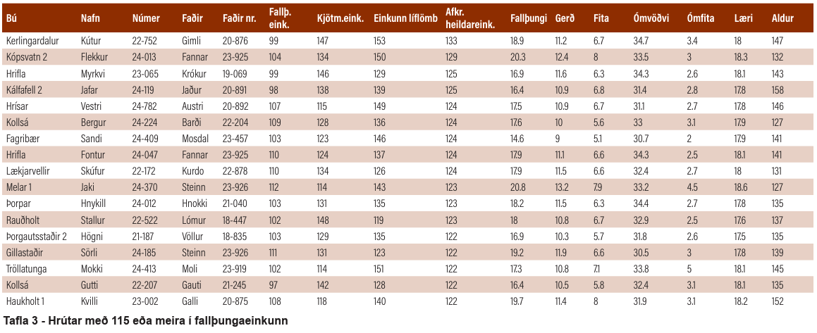 Hrútar sem skila miklum yfirburðum í fallþunga eru allrar athygli verðir á hverju búi því viðbótar kíló skilar fleiri krónum í budduna en svolítið hærri gerð. Verðmætastir eru að sjálfsögðu gripir sem ná frábærum árangri í öllum þremur þáttunum sem heildareinkunn er reiknuð út frá. Neisti 22-061 á Ketilseyri við Dýrafjörð skorar hæst í fallþungaeinkunn þetta árið. Afkvæmi hans eru nokkuð afgerandi best gerð í samanburði hrútanna á Ketilseyri og fallþungi sláturlamba undan Neista er 1,9 kg yfir meðaltali rannsóknarinnar. Neisti er sonarsonur Fálka 17-821 frá Bassastöðum. (Tafla 3 – Hrútar með 115 eða meira í fallþungaeinkunn)