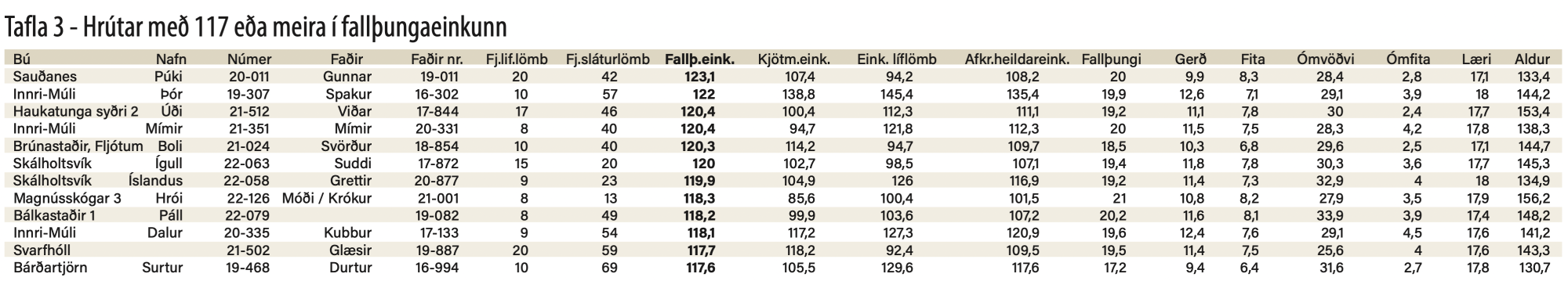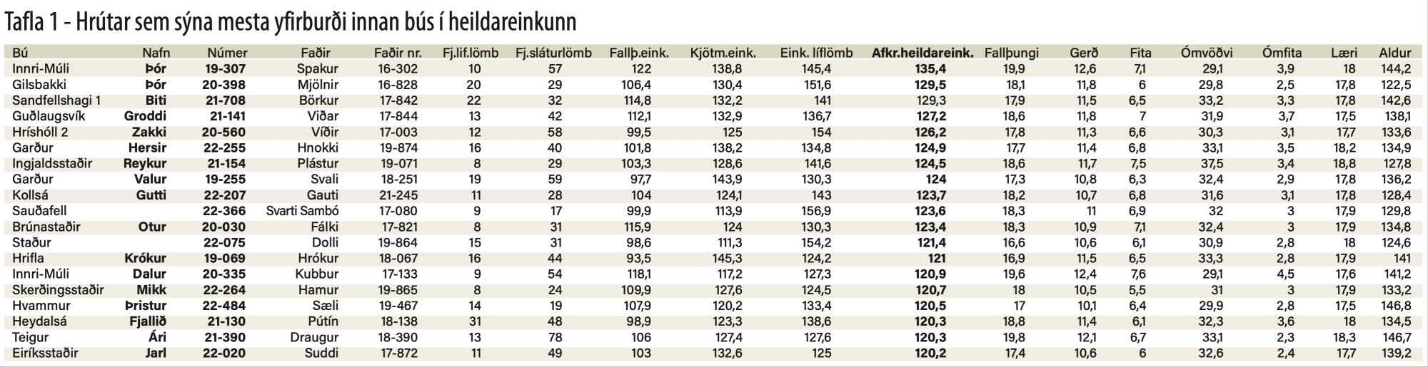Þór 19-307 í Innri-Múla á Barðaströnd sýnir líkt og haustin 2021 og 2022 fáheyrða yfirburði í öllum þáttum. Hann hefur verið einn besti hrúturinn á sínu heimabúi undanfarin ár en samt með öfluga keppinauta. Þór er sonur Spaks 16-302 sem stóð á toppnum á búinu í afkvæma- rannsóknum 2017-2019 og sýndi jafnan mikla yfirburði. Spakur 16-302 faðir Þórs var aðkeyptur frá Broddanesi 1 en móðir Þórs er sonardóttir Sigurfara 09-860 frá Smáhömrum. Þór er frábær lambafaðir eins og hann á kyn til. Hrúturinn í öðru sæti heitir einnig Þór. Hann hefur númerið 20-398 og er á Gilsbakka í Hvítársíðu. Hann er sonur Mjölnis 16-828 frá Efri-Fitjum. Þór 20-398 hefur staðið efstur í afkvæmarann- sóknum á Gils- bakka síðastliðin þrjú haust. Móðir hans er dóttir Kára 10-904 frá Ásgarði. Sá þriðji í röðinni er Biti 21-708 frá Sandfellshaga 1. Hann er undan Berki 17-842 frá Kjalvararstöðum og móðurfaðir hans er Svimi 14-956 frá Ytri-Skógum. Hersir 22-255 frá Garði í Þistilfirði er sá veturgamli hyrndi hrútur sem kemst lengst upp þennan metorðastiga í töflu 1. Hann er sonur Hnokka 19-874 frá Garði sem var mikið notaður þau tvö ár sem hann var á stöðvunum.