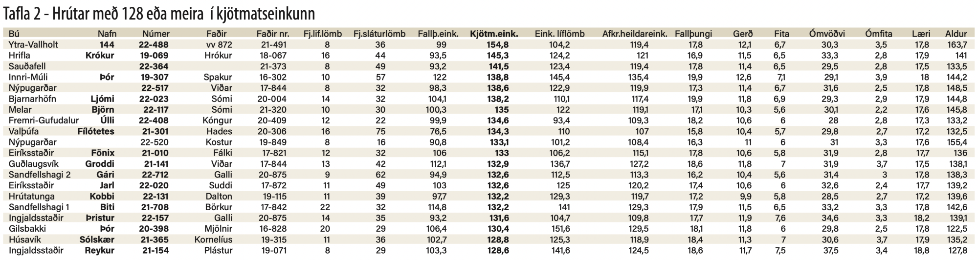 Þegar raðað er eftir kjötmatseinkunn stendur efstur veturgamall hrútur í Ytra-Vallholti í Skagafirði, Frakkur 22-488. Hann sýnir gríðarlega mikla yfirburði í kjötmatshlutanum á sínu heimabúi. Að auki er hann arfhreinn fyrir H154 arfgerðinni en í Ytra- Vallholti hefur mikið tillit verið tekið til riðuarfgerða við val á ásetningi um árabil. Annar í röðinni er fullorðinn hrútur í Hriflu í Þingeyjarsveit, Krókur 19-069. Hann er sonarsonur Hroka 15-969 frá Hesti og dóttursonur Dranga 15-989 frá Hriflu. Sá þriðji er Valur 22-364 frá Sauðafelli í Dölum. Þessi kollur er sonarsonur Fennis 19-857 frá Heydalsá og dóttursonur Fálka 17-821 frá Bassastöðum.