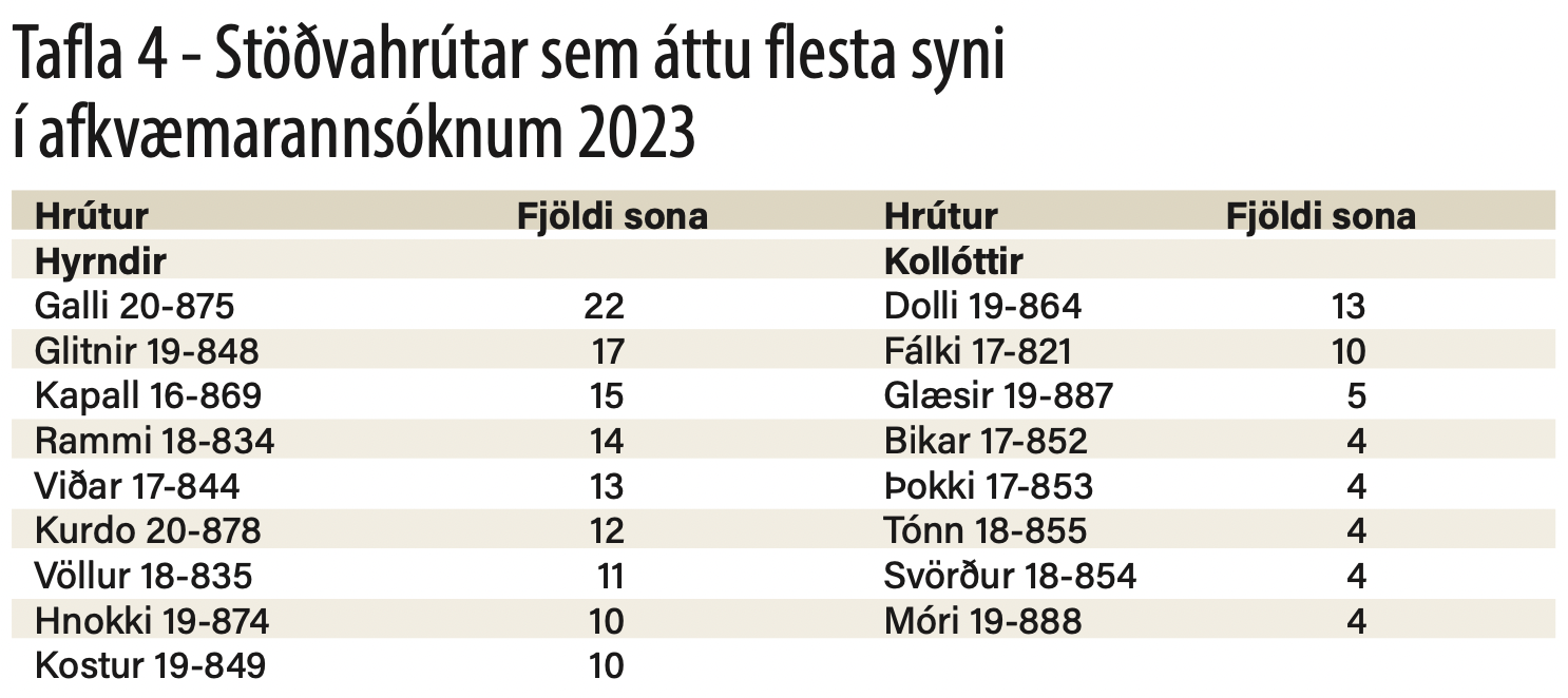 Í töflu fjögur má sjá þá stöðvahrúta sem áttu flesta syni sem tóku þátt í afkvæmarannsóknum á síðasta ári. Galli 20-875 frá Hesti á 22 syni en aðeins einn sona hans nær þó að standa efstur í heildareinkunn á sínu heimabúi. Næstur kemur Glitnir 19-848 frá Efri-Fitjum með 17 syni og 3 þeirra ná að standa efstir í heildareinkunn á heimabúum. Glitnir átti einnig næstflesta syni á síðasta ári og greinilegt að margir sona hans eru að standi sig vel sem lambafeður. Kapall 16-869 frá Hvoli á 15 syni en enginn þeirra nær að standa efstur. Næstur er svo Rammi 18-834 frá Hesti með 14 syni og greinilegt að synir hans reynast vel því hér er aðeins um eldri hrúta á ræða. Viðar 17-844 frá Bergsstöðum átti langflesta syni í sambærilegri töflu á síðasta ári. Hann á enn 13 syni og þar af standa 3 þeirra efstir á sínum heimabúum. Synir Viðars eru margir prýðilegir lambafeður. Það verður samt aldrei of oft varað við erfðagallanum bógkreppu sem um helmingur þeirra er væntanlega að dreifa til afkomenda sinna þó leynt fari. Hjá kollóttu hrútunum á Dolli 19-864 frá Miðdalsgröf 13 syni í afkvæmarannsóknunum. Einn þeirra stendur efstur á sínu heimabúi. Næstur kemur Fálki 17-821 frá Bassastöðum með 10 syni sem allt eru eldri hrútar. Tveir þeirra standa efstir á sínum heimabúum að þessu sinni.
