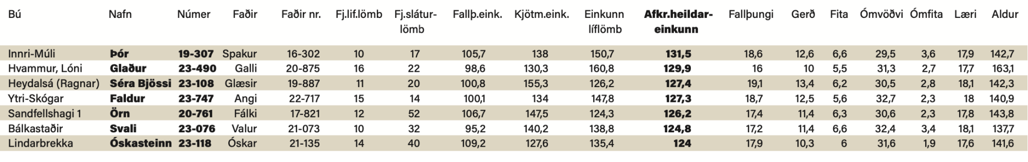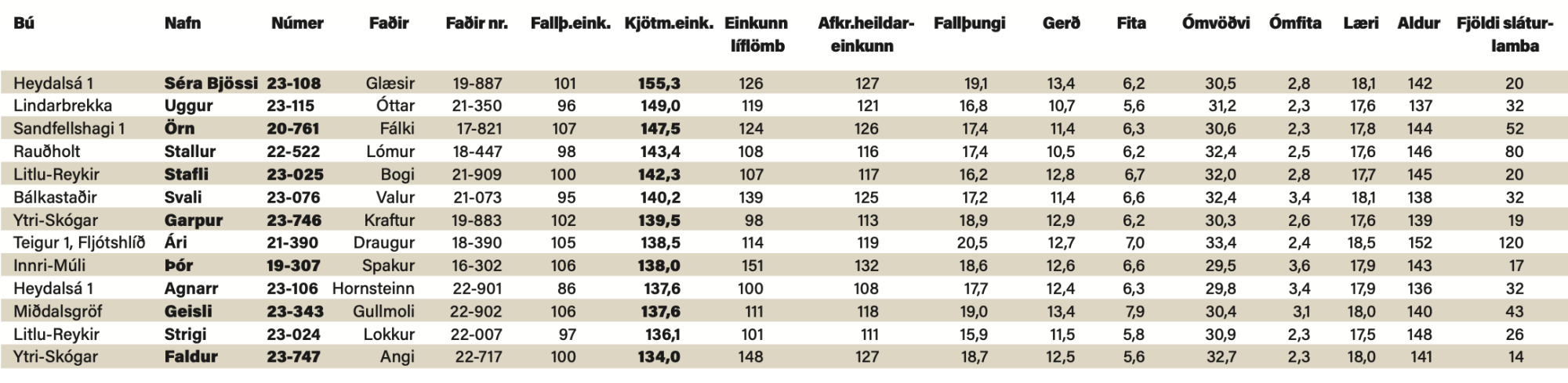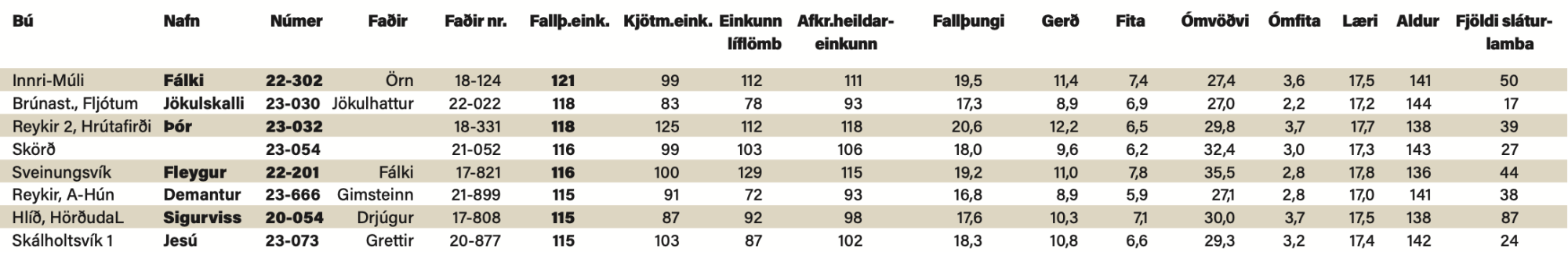 Þór 19-307 í Innri-Múla á Barðaströnd stendur hér efstur fjórða haustið í röð. Hann hefur verið einn besti hrúturinn á sínu heimabúi undanfarin ár en samt með mjög öfluga keppinauta. Þór er sonur Spaks 16-302 sem stóð á toppnum á búinu í afkvæmarannsóknum 2017-2019 og sýndi jafnan mikla yfirburði. Þór hefur reynst frábær lambafaðir en þetta var hans síðasti lambahópur. Í öðru sæti er veturgamall hrútur, Glaður 23-490 frá Hvammi í Lóni. Glaður er sonur Galla 20-875 frá Hesti. Glaður sýnir mikla yfirburði á sínu heimabúi bæði í mati á lifandi lömbum og í kjötmatshlutanum. Móðir Glaðs er dóttir Kögguls 17- 810 frá Hesti þannig að það er nokkuð þykkt Hestblóð í þessum hrút. Í þriðja sæti er annar veturgamall hrútur og heitir sá Séra Bjössi 23-108. Hann er frá Ragnari og Sigríði á Heydalsá en sonur Glæsis 19-887 frá LitluÁvík. Sláturlömb undan Séra Bjössa flokkast framúrskarandi vel og eins kemur hann sterkur út úr mati á lifandi lömbum. Sá fjórði í röðinni er nú orðinn stöðvahrútur, Faldur 23-937 frá Ytri-Skógum og þarf ekki að hafa mörg orð hér um þann glæsilega og eftirsótta kynbótahrút (sjá töflu 1).