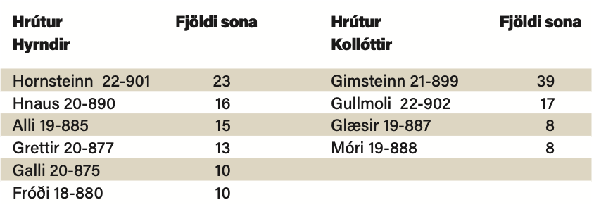 Í töflu fjögur má sjá þá stöðvahrúta sem áttu flesta syni sem tóku þátt í afkvæmarannsóknum á síðasta ári. Þarna er ánægjulegt að sjá að Þernuneshrútarnir þrír, sem eru frumkvöðlarnir í að koma riðuþolna geninu R171 í fjárstofn landsmanna, eiga flesta syni. Af þeim á Gimsteinn 21-899 langflesta syni, eða 39. Hvergi stendur þó sonur Gimsteins efstur í afkvæmarannsókn en allmargir standa sig þó vel í samanburði við aðra hrúta á sínu heimabúi. Bestu kostir Gimsteins liggja væntalega í dætrum hans sem virðast ætla að reynast bæði frjósamar og mjólkurlagnar. Hornsteinn 22-901, sonur Gimsteins, á 23 syni. Þar sem hann er sívalhyrndur hefur hann talsvert verið notaður á hyrndar ær. Hornsteinn virðist ætla að reynast föðurbetrungur sem lambafaðir. Í stórri rannsókn á Mýrum í Hrútafirði er sonur Hornsteins efstur í heildareinkunn og í nokkrum öðrum rannsóknum má sjá þá raða sér ofarlega. Gullmoli 22-902 frá Þernunesi á 17 syni og þar má sjá marga spennandi lambafeður. Í Miðdalsgröf við Steingrímsfjörð, Hólabæ í Langadal og á Brúnastöðum í Fljótum er það sonur Gullmola sem stendur efstur í heildareinkunn. Á nokkrum öðrum bæjum má sjá Gullmolasynina í fremstu röð á sínum heimabúum. Gullmoli fékk verðlaun sem besti lambafaðir stöðvanna árið 2023 og ánægjulegt að sjá að margir sona hans virðast skila kostum hans vel áfram sem lambafeður. Hnaus 20-890 frá Mýrum 2 á 16 syni í afkvæmarannsóknum þessa árs, Alli 19-885 frá Snartarstöðum á 15 syni og Grettir 20-877 frá YtriSkógum 13 syni. Synir Grettis standa efstir í þremur rannsóknum, synir Hnauss í tveimur rannsóknum en synir Alla skipa hvergi toppsætið í heildareinkunn (sjá töflu 4).