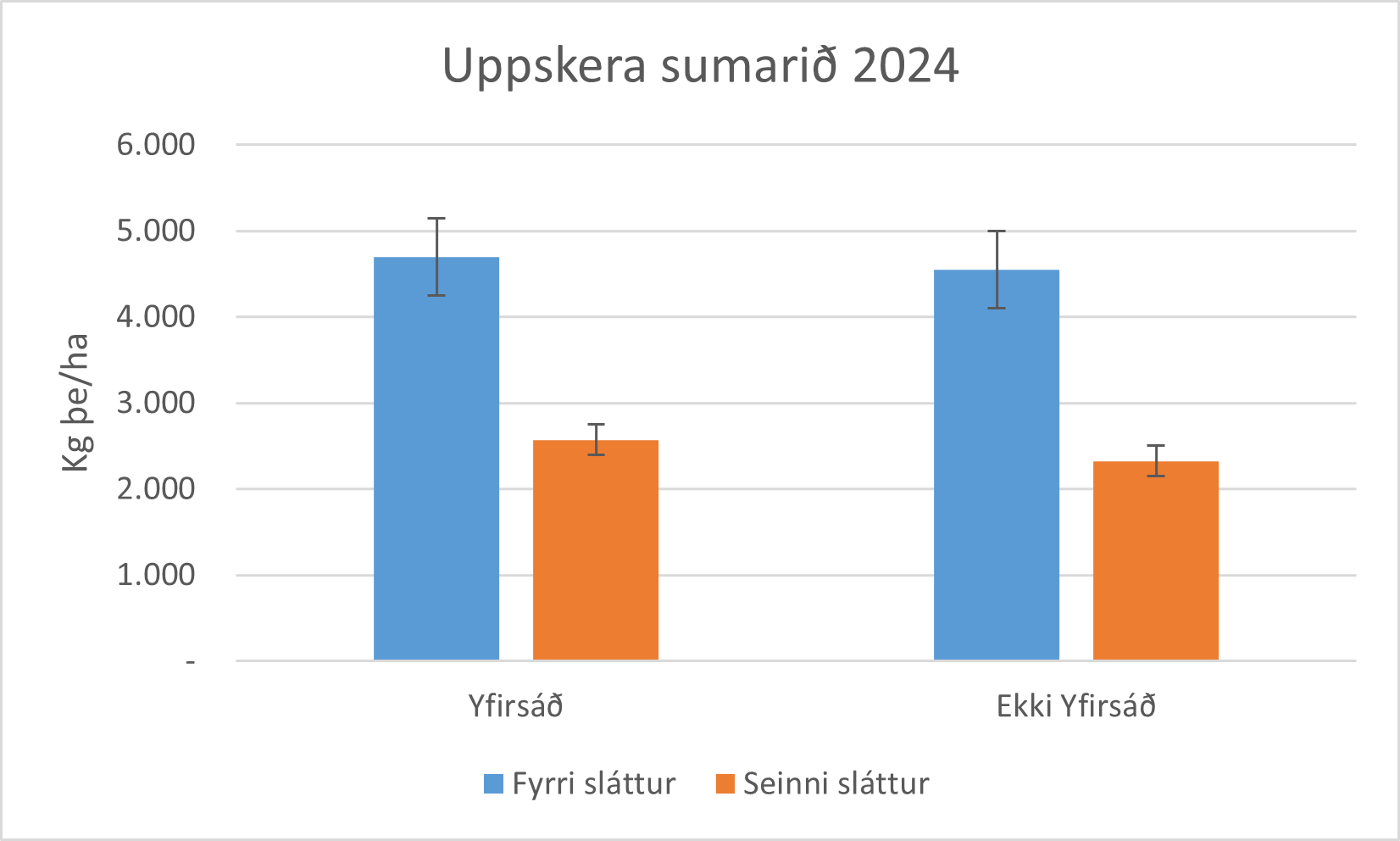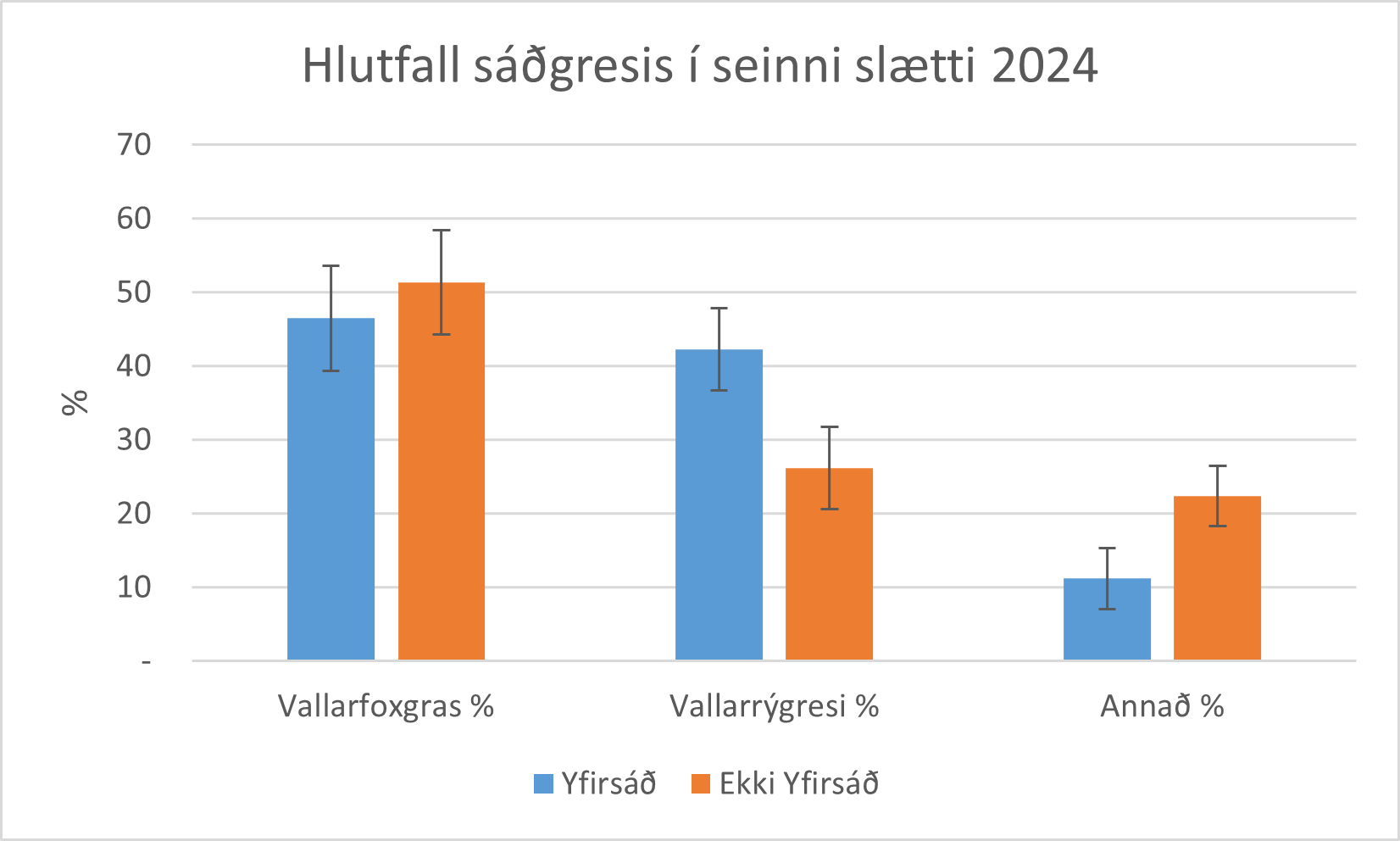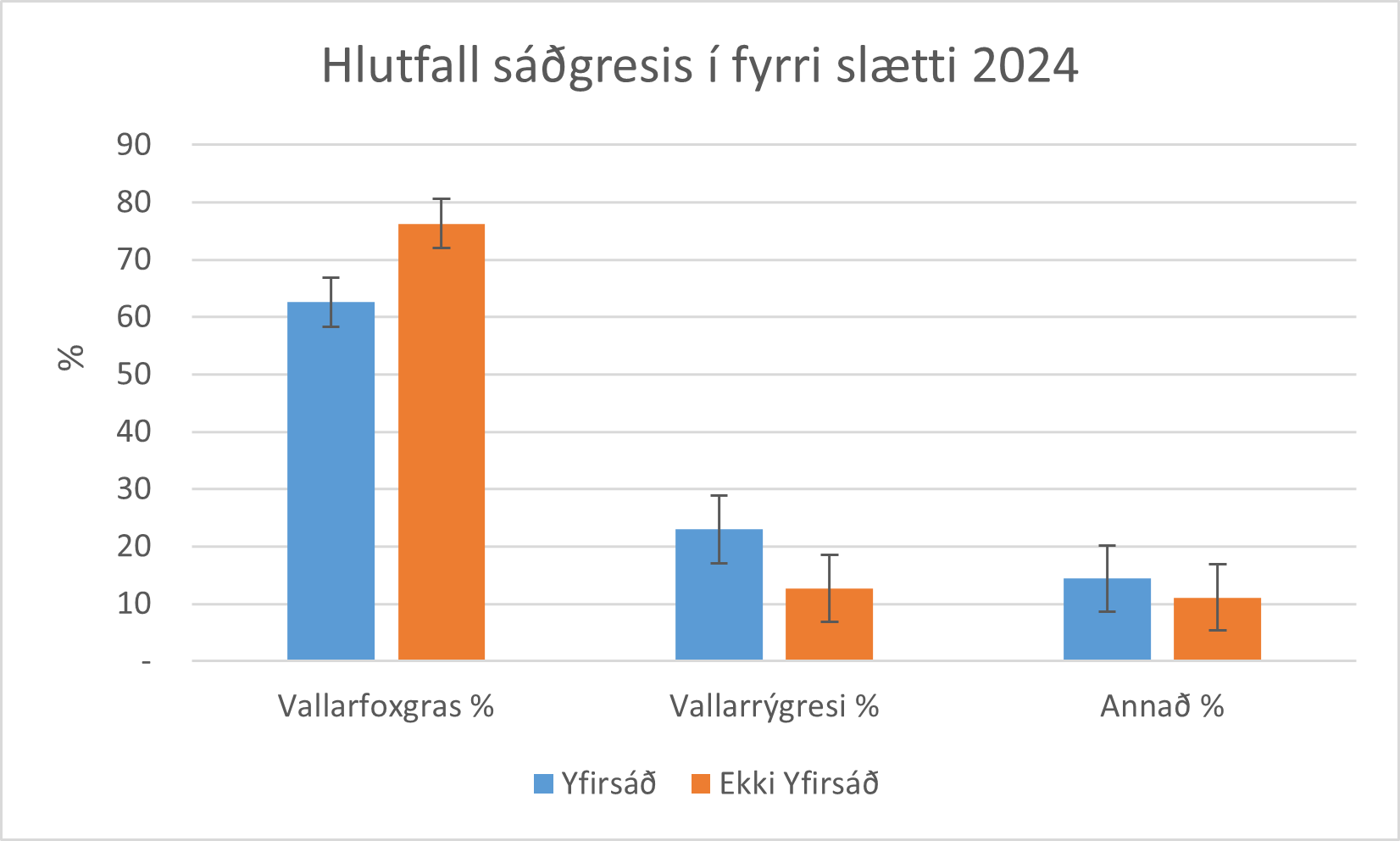 Í fyrri slætti sumarið 2024 reyndist hlutfall vallarfoxgrass hærra í þeim reitum sem ekki var sáð í. Möguleg skýring á því er aukið hlutfall vallarrýgresis. Því þó að sá munur hafi ekki reynst tölfræðilega marktækur þá var hlutfall rýgresis að meðaltali 23% í yfirsáðu röðunum en 13% í þeim röðum sem ekki var sáð í sem leiðir til lægra hlutfall vallarfoxgrass í heildaruppskeru.