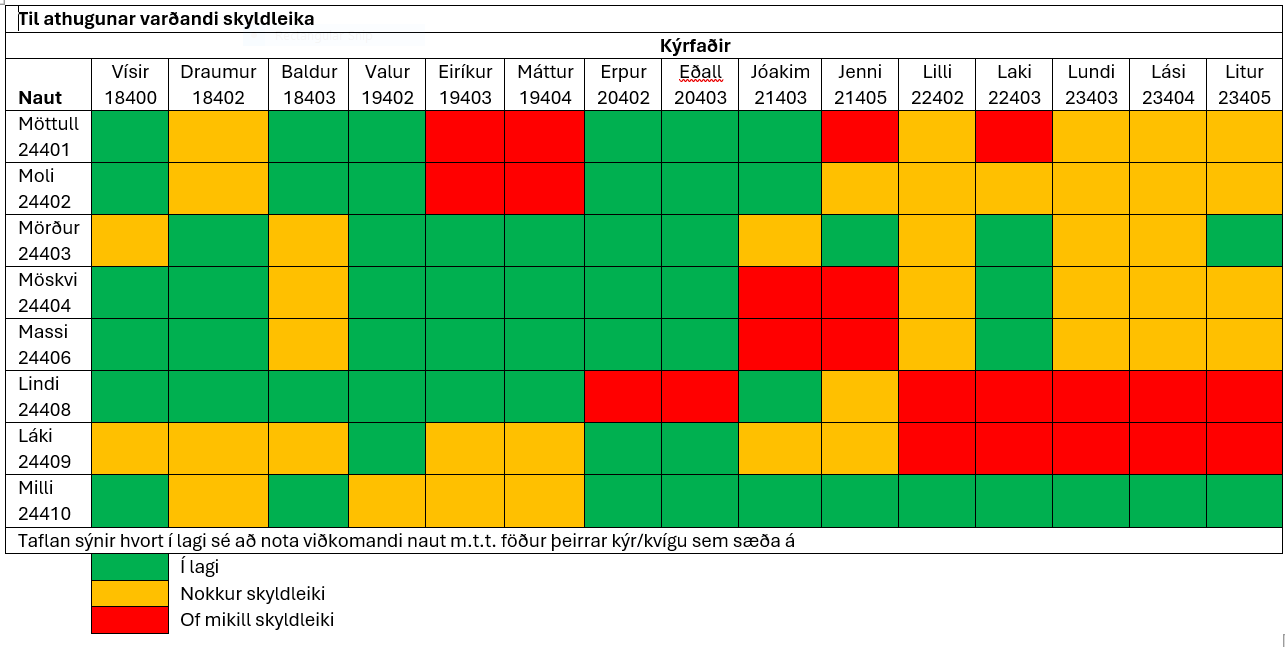 Að lokum er hér svo tafla sem nota má til þess að skoða hver skyldleiki þessara nauta er gagnvart notkun á þeim. Sýnt er með litum hvort rétt sé að nota viðkomandi naut á dætur eldri Angus-sæðinganauta út frá innbyrðis skyldleika. Ef við tökum dæmi má sjá að Möttull 24401 er of skyldur dætrum Eiríks 19403, Máttar 19404, Jenna 21405 og Laka 22403 og nokkuð skyldur dætrum Draums 18042, Lilla 22402, Lunda 23403, Lása 23404 og Litar 23405 en hægt er að mæla með honum á dætur Vísis 18400, Baldurs 18403, Vals 19402, Erps 20402 og Eðals 20403. Á sama hátt er t.d. ekki hægt að mæla með notkun annarra nauta en Marðar 24403 og Milla 24410 á dætur Jenna 21405.