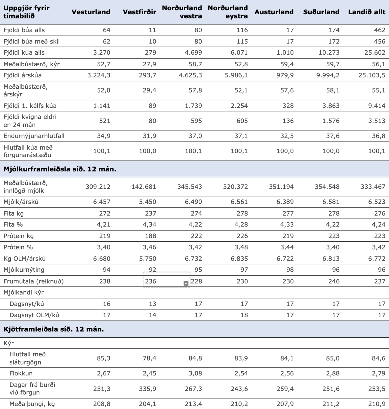 Þeir framleiðendur sem skiluðu einhverjum, en þó mismiklum upplýsingum, um afurðir kúa sinna á nýliðnu ári voru 470 en á árinu 2023 voru þeir 489. Niðurstöðurnar eru þær helstar að 25.103,5 árskýr skiluðu 6.523 kg nyt að meðaltali. Það er afurðaaukning um 112 kg/árskú frá árinu 2023 en þá skiluðu 25.308,6 árskýr meðalnyt upp á 6.411 kg. Þetta eru mestu meðalafurðir frá upphafi vega og níunda árið í röð sem þær ná yfir 6.000 kg eftir árskú. Umreiknaðar í orkuleiðrétta mjólk (OLM) eru meðalafurðir síðasta árs 6.772 kg/ árskú eða 144 kg meiri en árið áður.