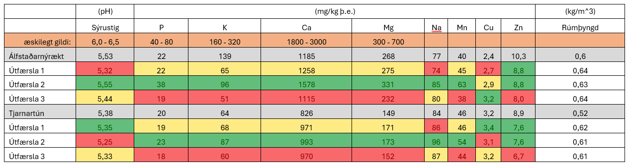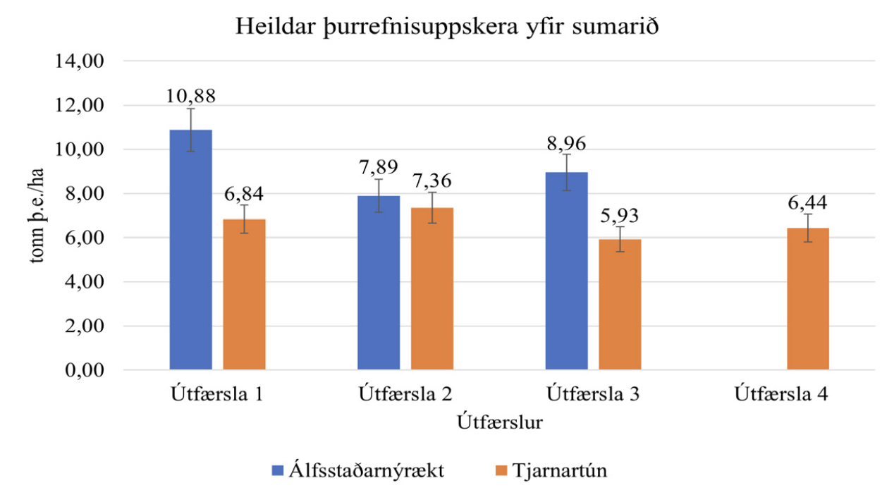 Út frá niðurstöðum uppskerumælinga sést að uppskeran af nýræktinni var mest á útfærslu 1 og munurinn á milli útfærslu 2 og 3 var lítill. Hins vegar var uppskeran á Tjarnartúninu mest í útfærslu 2 sem bendir til þess að eldri tún svari betur lífrænum áburði eða verr tilbúnum áburði. Það gæti verið vegna eiginleika jarðvegs eða grasategunda en hér er tækifæri fyrir fleiri rannsóknir. Þegar borin var saman seinni uppskera allra útfærslna var hlutfallið á milli magns þurrefnisuppskeru minna en í fyrri slætti sem bendir til þess að áburðaráhrif kjötmjölsins voru enn marktæk. Kostnaður á tonn heildar þurrefnisuppskeru var mestur á útfærslu 2 á báðum túnum en lægstur á útfærslu 3. Þegar horft er til skamms tíma, eitt ár eða svo, þá lítur kjötmjölið ekkert svakalega vel út miðað við tilbúna áburðinn en hafa þarf í huga langvarandi áburðaráhrif kjötmjölsins. Meirihluti næringarefna í kjötmjöli er bundinn í lífrænar sameindir sem eru ekki aðgengilegar plöntum fyrr en sameindirnar brotna niður í jarðveginum en það ferli eykur örveruvirkni. Það eru margir þættir sem stýra hversu hratt niðurbrotið er á lífrænum sameindum eins og örverusamsetning, jarðvegsgerð og veðurfar. Þetta verkefni var BS ritgerðin mín í Landbúnaðarháskóla Íslands og þar má finna ítarlegri upplýsingar. Hægt er að nálgast BS ritgerðina inni á Skemman.is með titlinum „Blöndun kúamykju og kjötmjöls til túnáburðar í landbúnaði“.