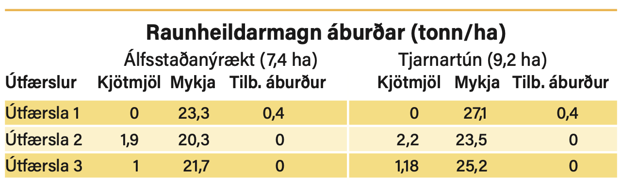 Útfærsla 1 var hefðbundin áburðargjöf sem er 400 kg af þrígildum 23:3:8 NPK áburði og 30 tonn af mykju á hektara, útfærsla 2 fékk 2,8 tonn af kjötmjöli og 30 tonn af mykju á hektara og útfærsla 3 fékk 1,4 tonn af kjötmjöli og 30 tonn af mykju á hektara. Magn kjötmjöls á hektara var ákveðið út frá sekkjafjölda þar sem kjötmjölið var selt í 700 kg stórsekkjum. Eftir útfærslu kom í ljós að það fór minna en áætlað var af kjötmjöli og mykju á túnin en munurinn á milli útfærslna var hlutfallslega svipaður. Notuð var kúamykja úr okkar eigin fjósi sem var um 3,5%. Kúamykjunni og kjötmjölinu var blandað saman í gámi með opinn topp við hliðina á fjósinu. Það þurfti þrjá traktora og einn lyftara til að framkvæma verkefnið; einn til að dæla úr haughúsinu, einn til að hræra í gámnum og einn til að dreifa blöndunum á túnin með 15 tonna haugsugu með slöngubúnaði. Lyftarinn var notaður til að lyfta sekkjunum yfir gáminn þar sem skorið var undir þá og kjötmjölinu sturtað ofan í. Þetta var 3 til 5 manna verk.