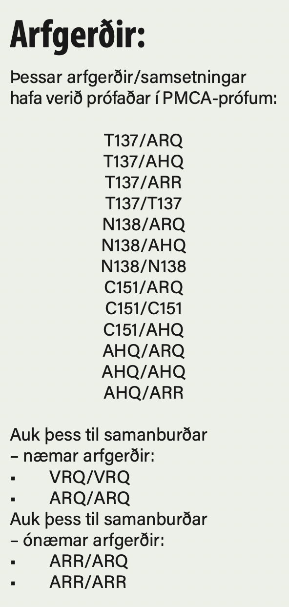 - VRQ/VRQ og ARQ/ARQ sem þekktar næmar arfgerðir og