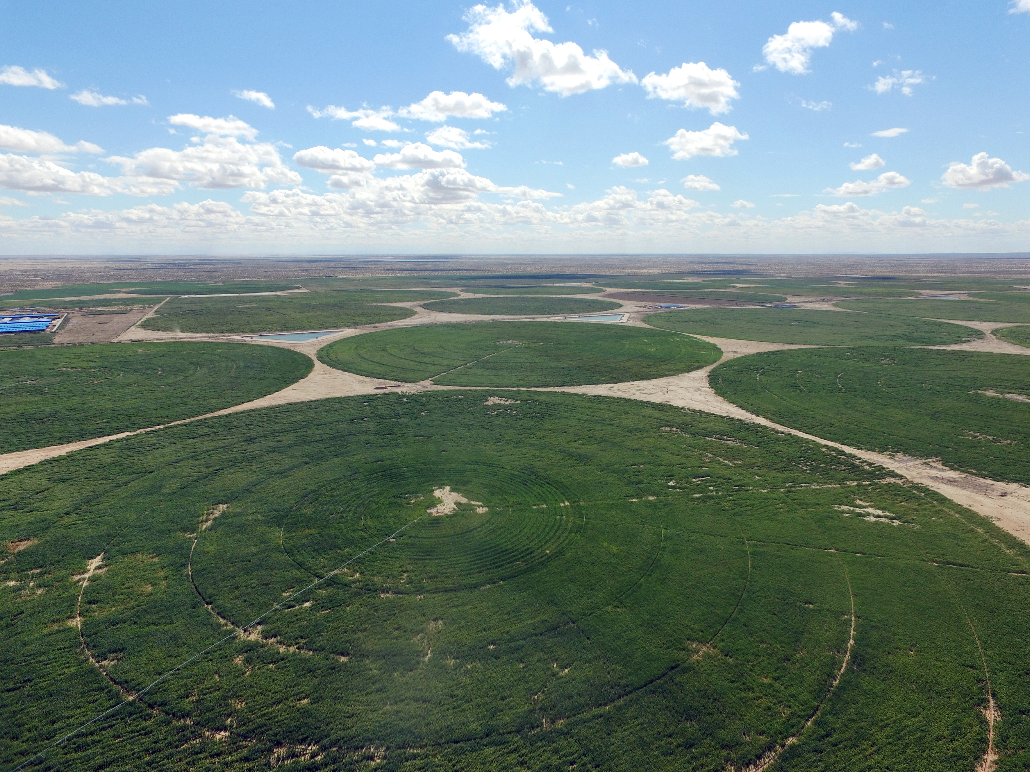 Hér má sjá hvernig ræktunin er gerð. Hringlaga akrar eftir vökvunarkerfin sem ganga í hring út frá miðju. Til hliðar sést í fjósþyrpingu.