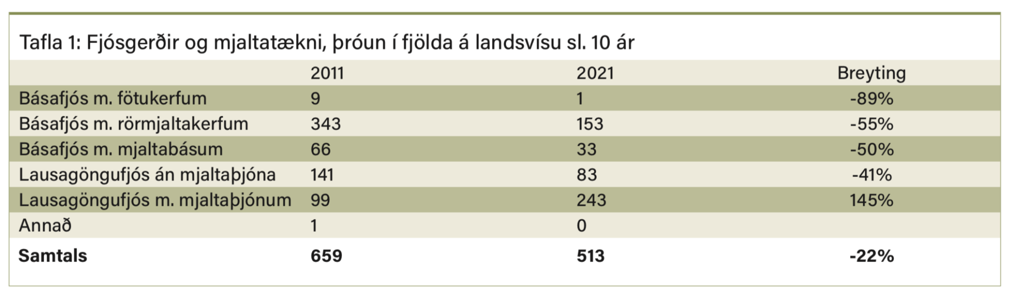 Undirflokkar þessara tveggja megin fjósgerða taka svo mið af þeirri mjaltatækni sem er í notkun í fjósunum. Niðurstöðurnar má sjá í töflu 1, en þar kemur fram að frá árinu 2011 hefur básafjósum fækkað verulega, úr 418 í 187, eða um 55%. Á sama tíma hefur lausagöngufjósum fjölgað úr 240 í 326 sem er rúmlega 36% aukning á liðnum áratug.