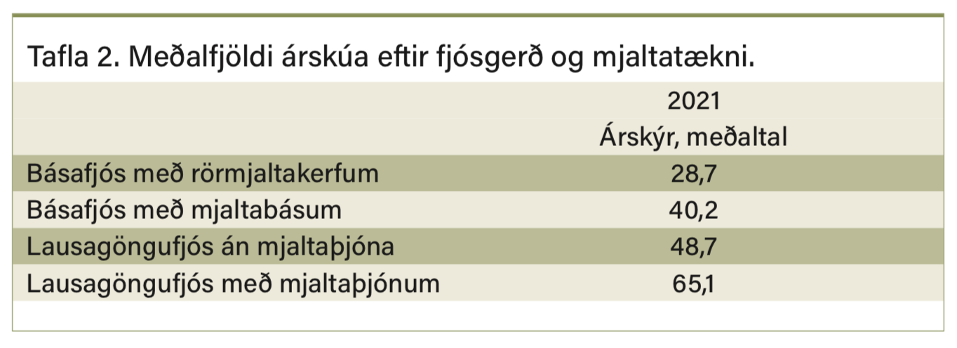 Ekki þarf að koma á óvart að lausagöngufjós með mjaltaþjónum eru stærst að meðaltali en árskúafjöldi þeirra í árslok 2021 var 65,1 kýr en þessi bú eru að jafnaði með 1,25 mjaltaþjóna. Þrátt fyrir að þessi bú beri af í fjölda kúa, þá er bústærðin enn vafalítið nokkuð undir þeim mögulega árskúafjölda sem þessi fjós geta mjaltatæknilega séð borið.