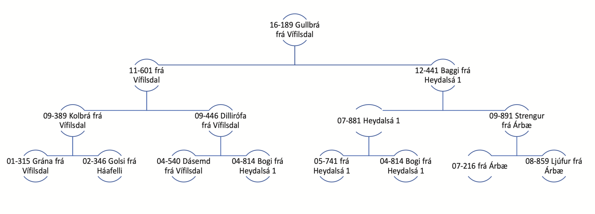 Gullbrá er kollótt og hreinhvít að lit. Faðir hennar er Baggi 12-441 sem var kaupahrútur frá Ragnari og Sigríði á Heydalsá. Faðir Bagga, Strengur 09-891, og móðurfaðir, Bogi 04-814, eru þekktir sæðingastöðvahrútar sem vitað er að ekki báru ARR. Baggi er ógreindur og á ekki fleiri lifandi afkvæmi en Gullbrá. Hins vegar eru til afkomendur hans. Frekari greiningar á hjörðinni gætu því hugsanlega varpað ljósi á það hvort Gullbrá erfir ARR í gegnum Bagga frá Heydalsá eða hvort móðurætt hennar hafi búið yfir því.