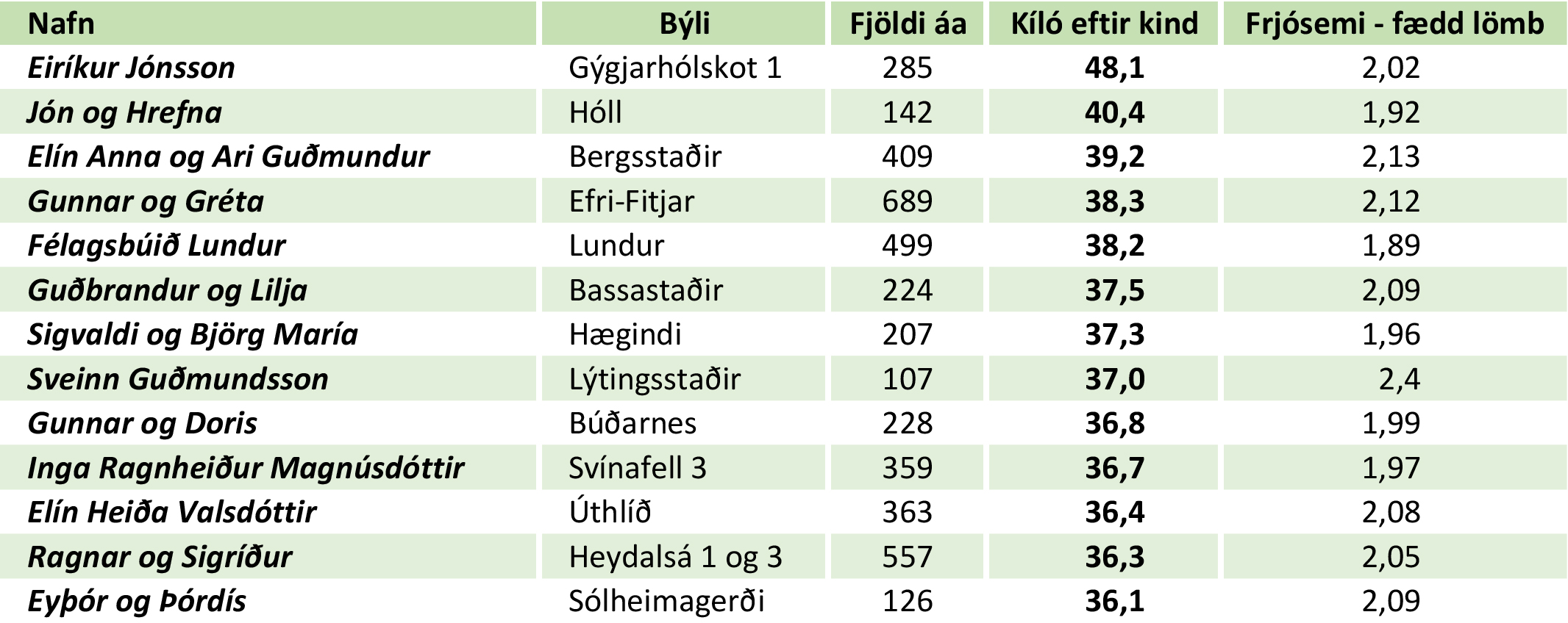 Í 1. töflu er listi yfir öll þau bú sem hafa 36 kg eða meira eftir hverja kind árið 2017 og fleiri en 100 ær í skýrsluhaldi.