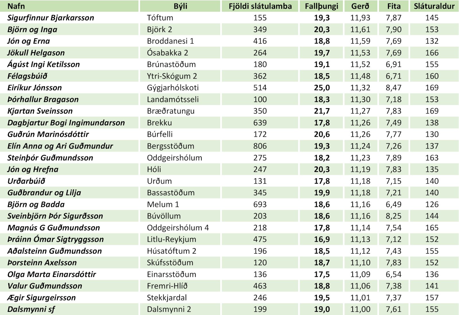 Í skýrsluhaldinu eru upplýsingar um tæplega 542.000 sláturlömb haustið 2017. Meðalfallþungi þeirra var 16,8 kíló litlu minni en árið á undan (17,0 kíló - 2016) og meðaltal síðustu fimm ára er 16,5 kíló. Meðaltal einkunnar fyrir holdfyllingu er 9,07 árið 2017 (9,05 - 2016), fimm ára meðaltal 8,86 og meðaltal einkunnar fyrir fitumat er 6,44 árið 2017 (6,71 - 2016), fimm ára meðaltal 6,52. Oft er þetta skoðað sem hlutfallstala holdfyllingar og fitu, sú tala var 1,41 haustið 2017. Hagstæðasta hlutfallið má finna í Suður-Þingeyjarsýslu (1,50). Af búum sem höfðu holdfyllingarmat yfir 9,5 árið 2017 er þetta hlutfall hagstæðast hjá Eyþóri Péturssyni, Baldursheimi 3, Mývatnssveit með hlutfallstölu 2,00. Í 2. töflu má finna öll þau bú sem höfðu gerðarmat 11,0 eða hærra árið 2017 og fleiri en 100 sláturlömb.