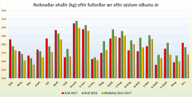 Afurðir eftir fullorðnar ær voru 27,7 kíló eftir hverja kind árið 2017 sem er 0,6 kílóum minna árið á undan sem var metár (28,3 kg – 2016) en heldur meira en meðalafurðir síðustu fimm ára sem reiknast 27,5 kíló. Á 1. mynd má sjá afurðir síðustu tveggja ára (2017 rauð súla, 2016 græn súla) sýndar eftir sýslum ásamt meðaltali áranna 2013-2017 (blá súla) í viðkomandi héraði.