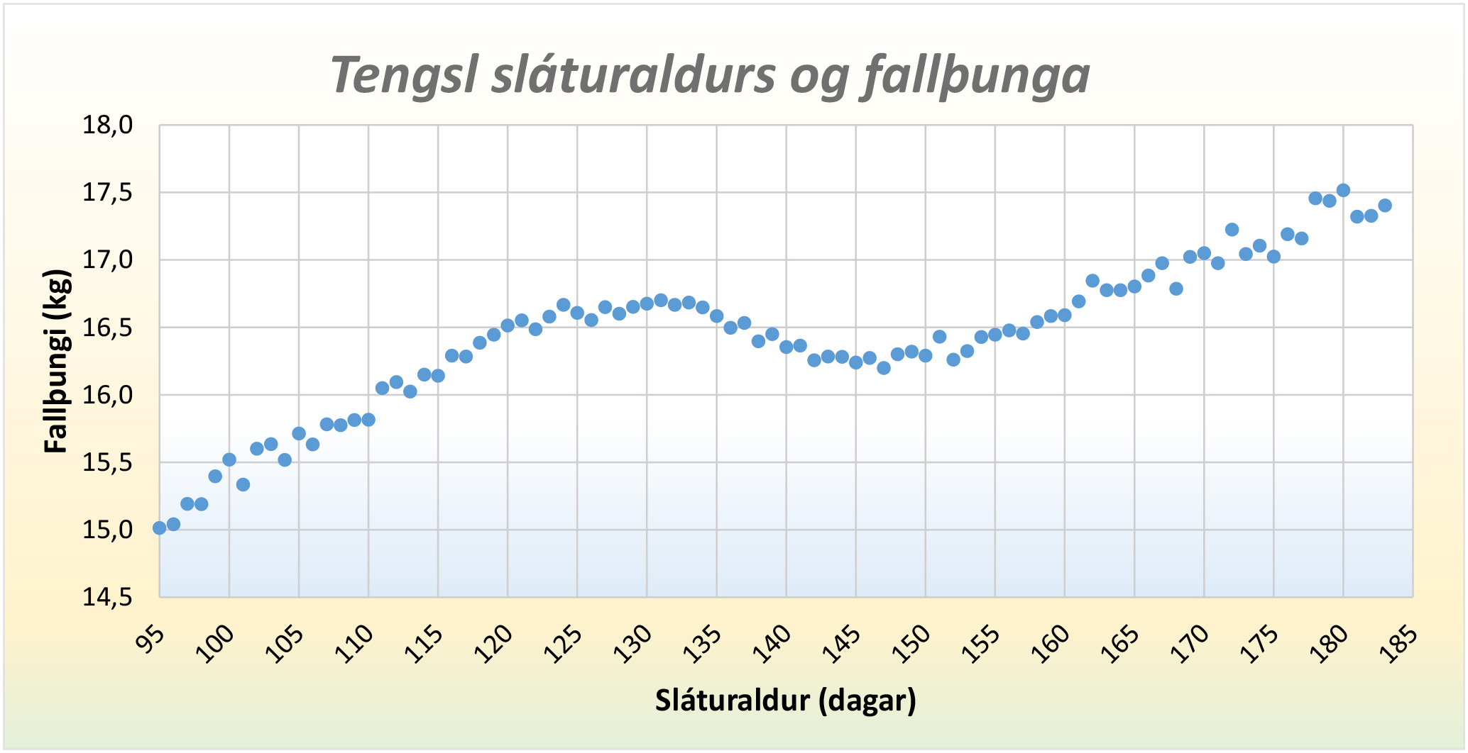 Meðalaldur sláturlamba er 138 dagar fyrir árið 2017. Á 2. mynd má sjá tengsl sláturaldurs og fallþunga lamba. Sambærilegar myndir fyrir síðustu ár sýna sama mynstur, þ.e. fram að 135 daga aldri eru lömbin stöðugt að þyngjast en síðan virðist fallþungi lambanna falla og ekki aukast að ráði fyrr en þau eru orðin 160 daga gömul. Þetta atriði þurfa bændur að skoða mjög vel. Vitað er að ekki kemst allt fé til slátrunar á sama tíma en ef menn gera ekki ráðstafanir varðandi beit eru menn að tapa á því að geyma lömbin of lengi. Áborin há er hentugasta beitin fyrir lömb sem þarf að geyma í 2-4 vikur en grænfóður getur borgað sig fyrir minnstu lömbin sem geyma á, í mánuð eða lengur – ávinning kálbeitar þarf þó alltaf að horfa á með gagnrýnum augum og ekki er hægt að mæla með bötun lamba nema eftirspurn sé eftir slíku.