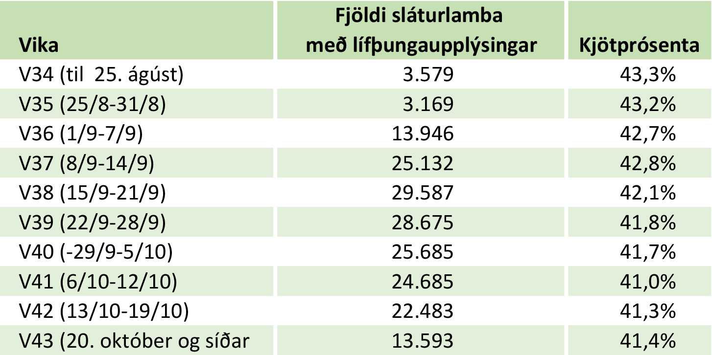 Þessu tengt þurfa menn að hafa í huga hvernig kjötprósenta lamba breytist eftir því sem lömbin verða eldri. Í skýrsluhaldinu voru ríflega 190.000 lömb árið 2017 sem hafa upplýsingar um kjötprósentu þar sem líða 15 dagar eða minna frá vigtunardegi lífþunga að sláturdegi. Í 3. töflu má sjá hvernig kjötprósentan breytist eftir sláturvikum yfir haustið. Í ágústslátrun er kjötprósentan 43,3% en lækkar svo niður í 41% þegar komið er fram í október. Þannig er lamb sem vigtar 38 kg 20. ágúst að vigta 16,5 kíló væri því slátrað þá, en lamb með sama lífþunga í byrjun október myndi vigta 15,6 kíló. Munur upp á 900 grömm. Þetta er atriði sem bændur þurfa almennt að gefa betri gaum og vera duglegri við að vigta lömb og velja sláturlömb á þeim grunni.