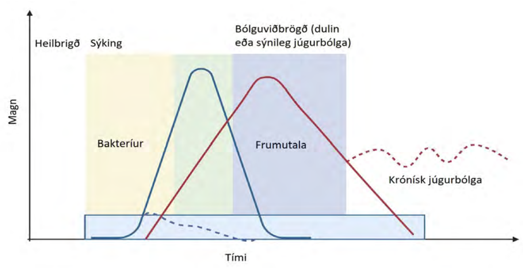 Skýringarmyndin sem hér er meðfylgjandi, og kemur frá IDF (International Dairy Federation) lýsir þessu vel. Gula svæðið sýnir tímabilið þegar bakteríurnar eru að koma sér fyrir og græna svæðið sýnir tímabilið þegar fjöldi baktería er í hámarki og í kjölfarið snarhækkar frumutalan vegna ónæmisviðbragðs kýrinnar. Bláa svæðið sýnir svo hvað hefur gerst eftir að ónæmiskerfið er í raun að takast á við bakteríurnar. Hér snarlækkar fjöldi bakteríanna og fer niður í það að vera vart greinanlegar. Ef mjólkursýni er sent inn á þessu tímabili gefa mælingar á því eðlilega engar niðurstöður og þar sem sýklalyf hafa aðeins áhrif á bakteríur, en ekki frumutöluna sem slíka, myndi meðferð með sýklalyfjum ekki hafa áhrif. Ónæmiskerfið hefur sem sagt í raun slegið á sýkinguna en frumutalan mælist enn há þrátt fyrir að bakteríurnar séu að mestu á bak og burt.