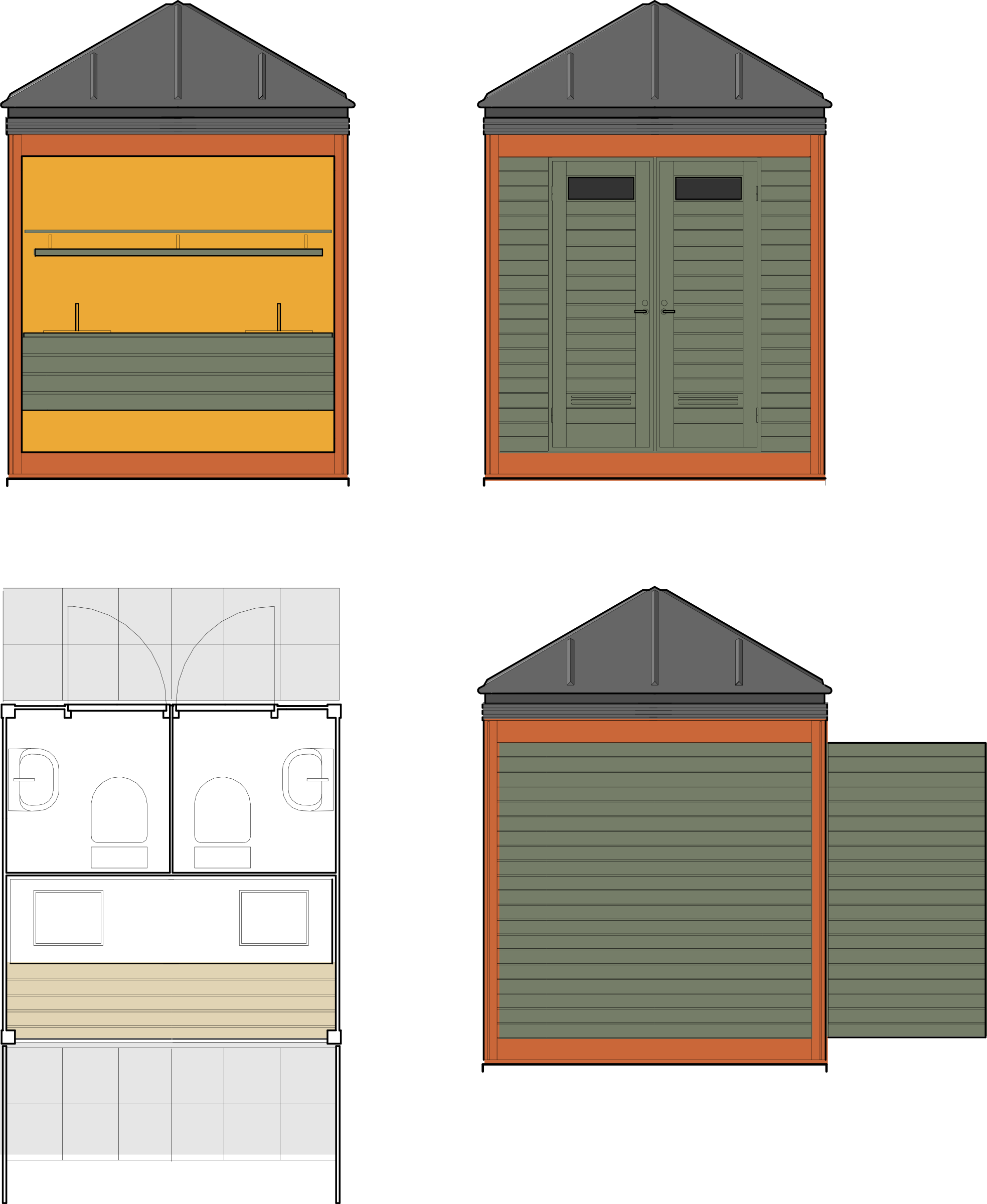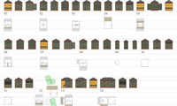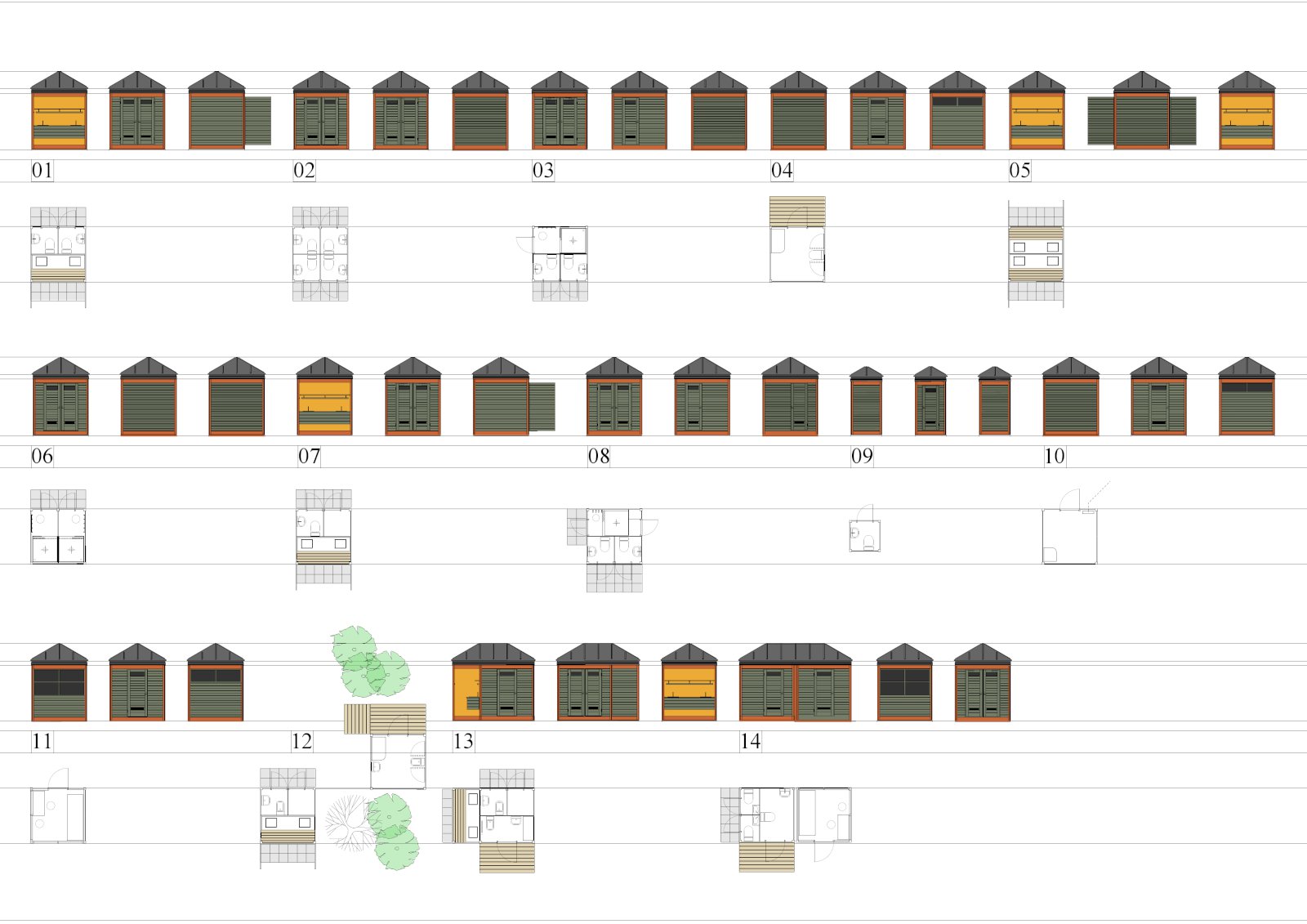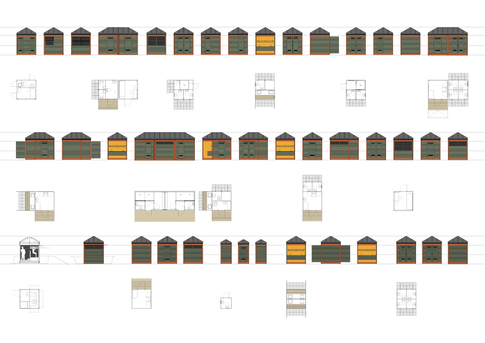Einingahúsin eru byggð upp af burðarvirki úr tré, hornstoðum og bitum í gólfi og undir þaki. Þökin eru úr þykkum krossviði, klædd þykkum, svörtum asfaltpappa með sendinni áferð. Í algengustu gerðinni eru tveir salernisklefar með handlaugum í öðrum helmingi hússins en vaskbekk í hinum. Skjólveggir ganga þá út frá hornum og eru notaðir til lokunar yfir vetrartímann. Mörg tilbrigði eru til við þessa gerð, meðal annars einingar sem ætlaðar eru fötluðu fólki. Stökum einingum má raða saman að vild en einnig er hægt að fella tvær eða þrjár einingar saman undir heilu þaki.