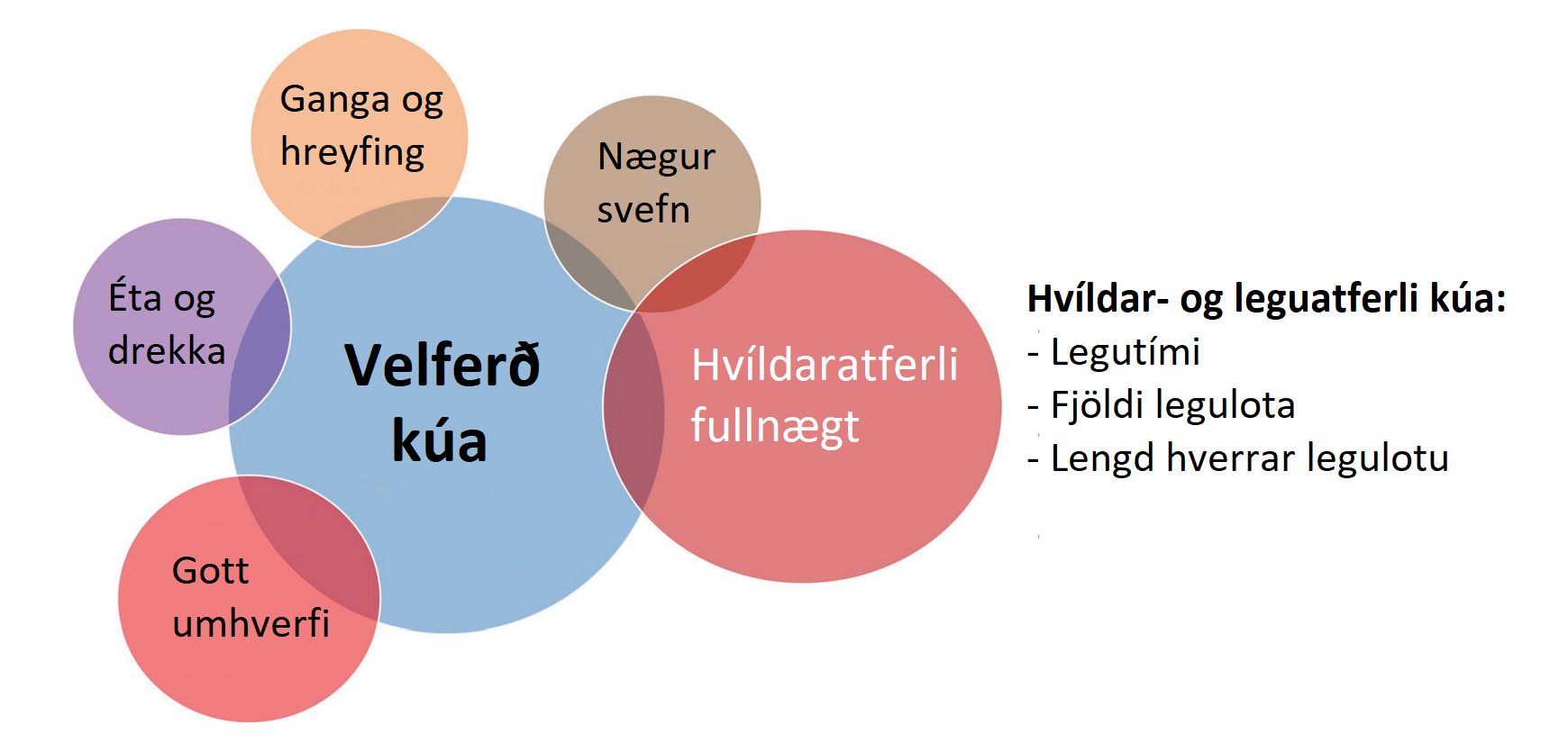 Góð velferð kúa er summa margra þátta og þessir þættir geta auk þess verið harla breytilegir á milli kúa, þ.e. hvað skiptir viðkomandi kú mestu máli. Að því gefnu að legan sé kúnni einna mikilvægust, er þó ákveðinn rauður þráður í þessu sem hægt er að fylgja. Með því að staðla sem mest ytra umhverfi kúnna, og það hvernig bústjórninni er háttað, má draga verulega úr breytileikanum á milli kúa og auka líkurnar á því að legu- og hvíldaratferli kúnna verði sem best. Á mynd 1 má sjá samantekt dr. Cook á því sem hann telur mikilvægustu áhrifaþætti á velferð kúa. Þar kemur m.a. fram að mikilvægur þáttur varðandi velferð kúa er möguleikinn á göngu og hreyfingu, þá þarf fóðrun og aðgangur að vatni að vera í lagi. Umhverfi þeirra þarf auk þess að vera gott og taka tillit til þarfa kúnna.
