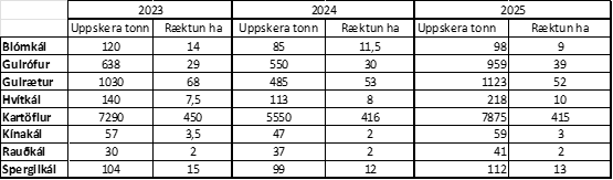 Sumarið 2024 var óvenju kalt og erfitt fyrir ræktendur, enda varð uppskera víða svo léleg að stjórnvöld sáu ástæðu til að greiða sérstakar bætur vegna uppskerubrests. Þrátt fyrir þetta létu bændur ekki bugast, og samkvæmt ræktunarskráningum fyrir árið 2025 var heildarflatarmál í ræktun á kartöflum og grænmeti um 550 hektarar sem er um 10 hekturum meira en 2024.